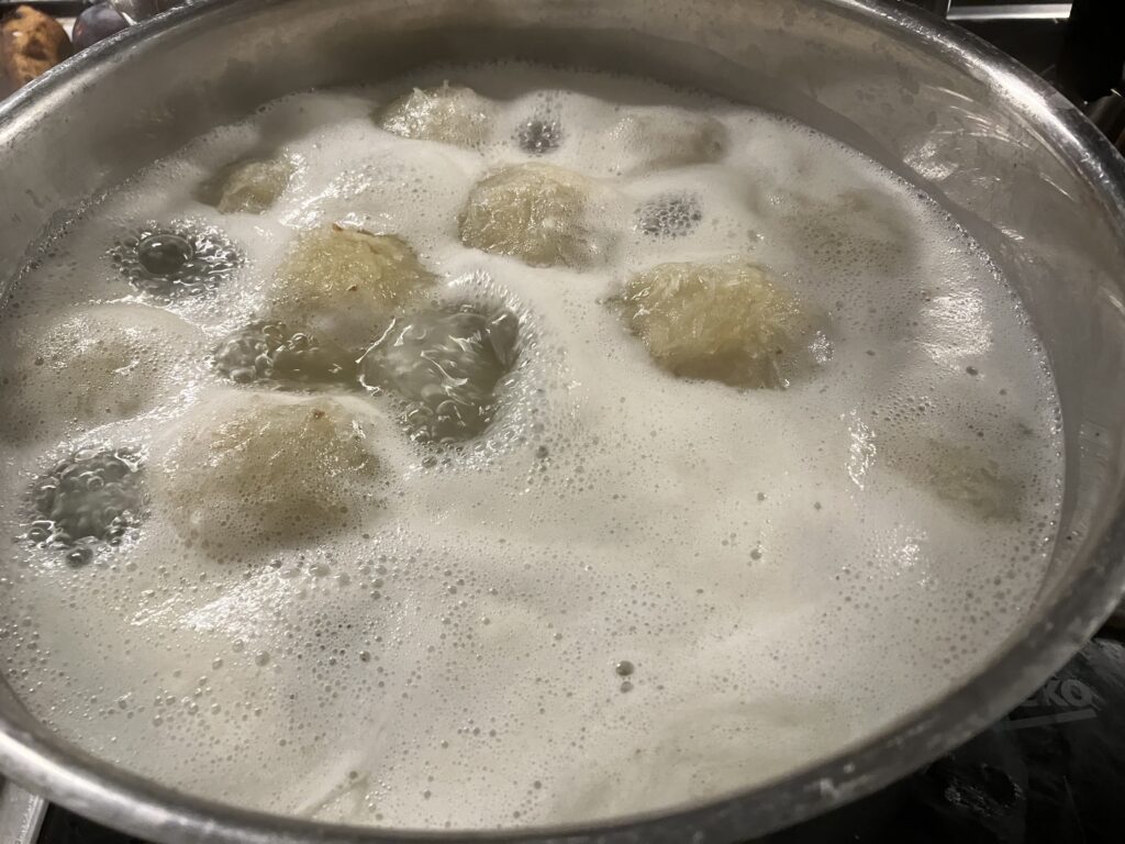 Da die Zwiebeln nicht schwarz werden sollen, müsst Ihr ein Gefühl für die Klöße haben.
