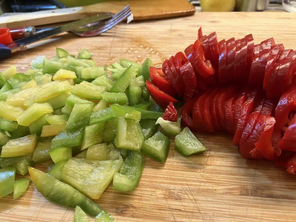 Paprika zerkleinern. Farbe egal, Menge im Prinzip auch. Das was weg muss.