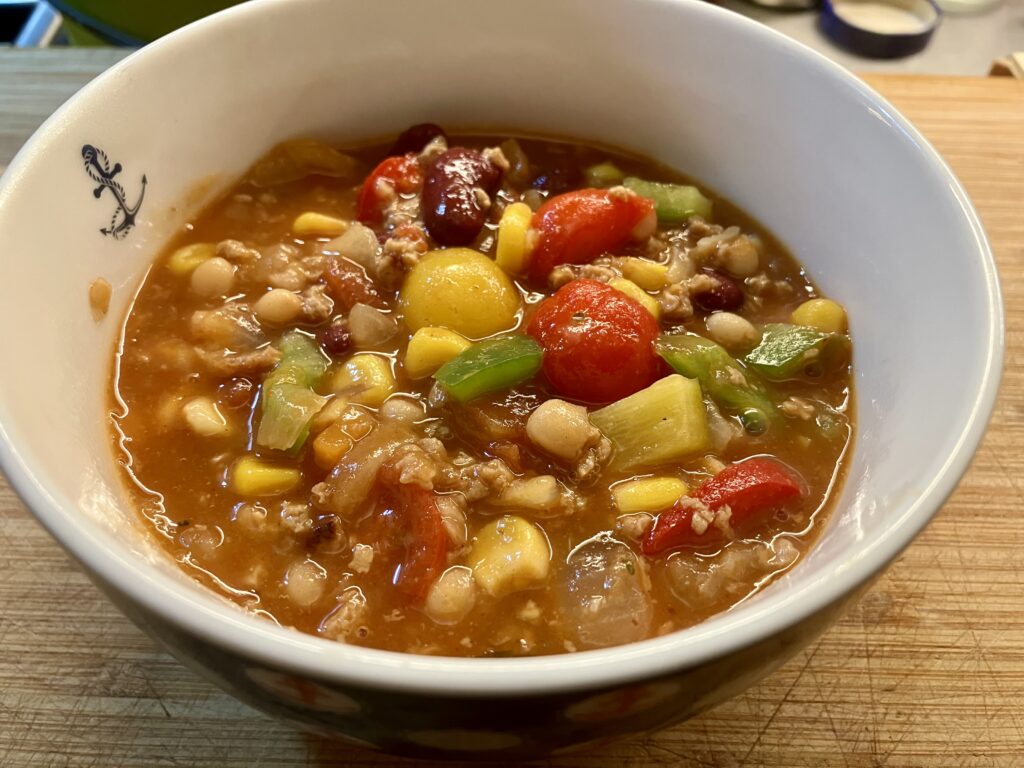 Ein Potpourri an Dosen-Bohnen kam rein, natürlich Rinderhack und klein geschnittene Bacon-Scheiben, die sich fast auflösen und ihr Aroma verteilen. Dazu zwei bös’ brennende kleine Chilis vom Indischen Supermarkt, die wir beutelweise kaufen und einfrieren.