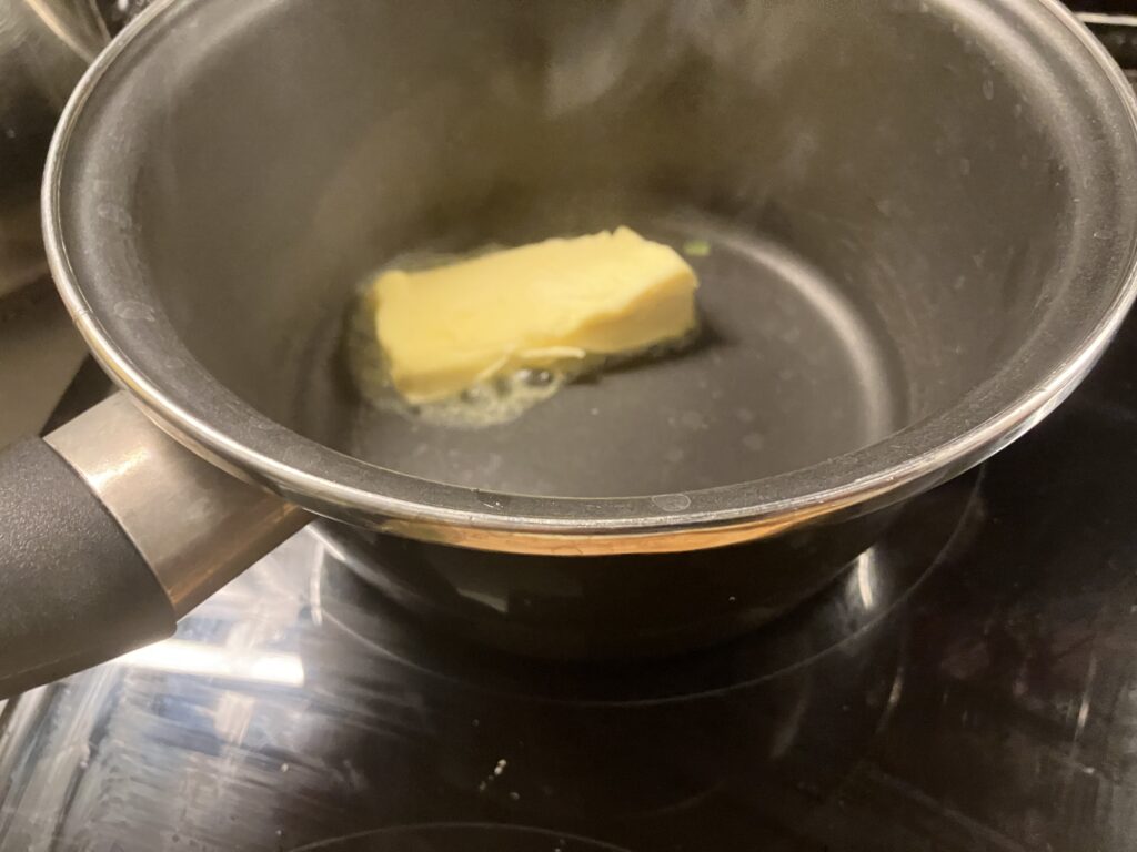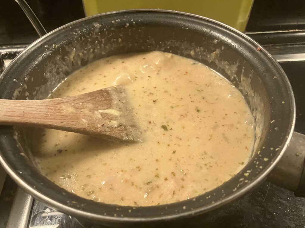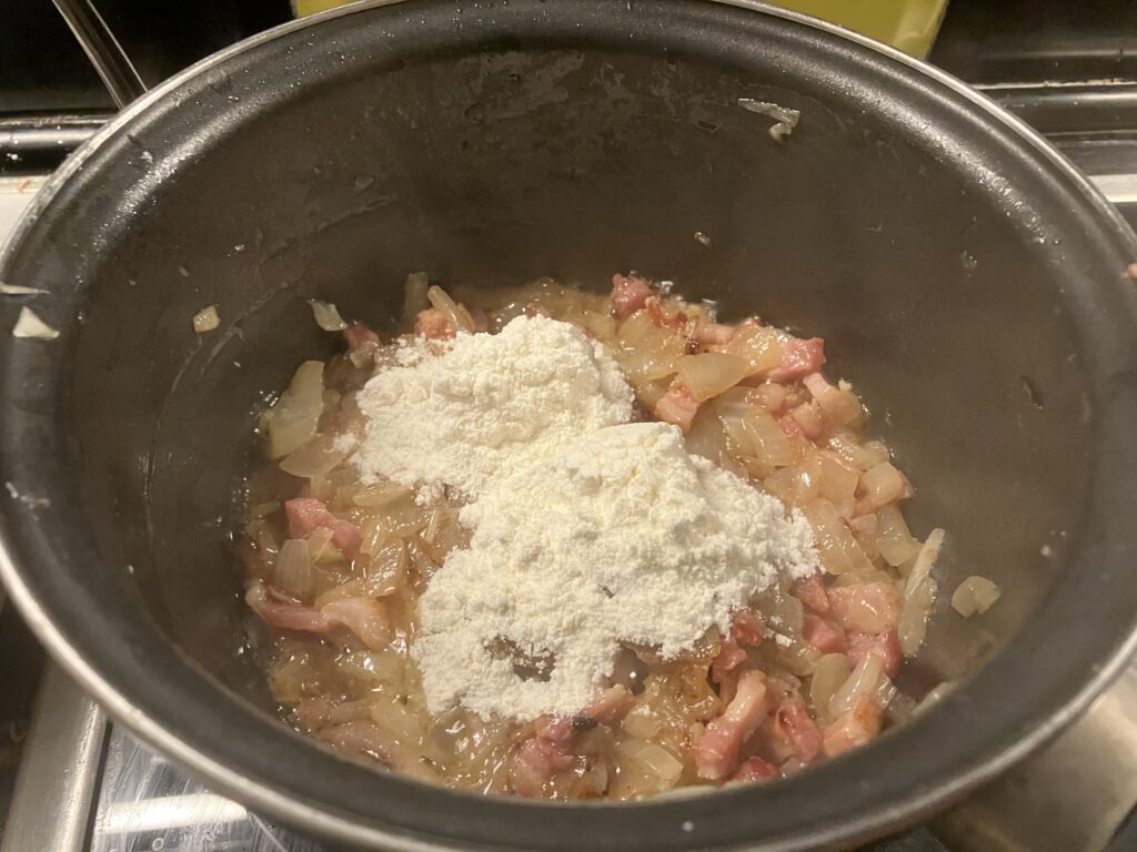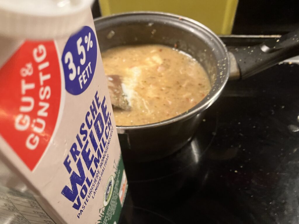Die Soße soll nicht zu dunkel werden, weil es eine Käsesoße wird. Deswegen nicht zu viele Röstaromen zaubern.