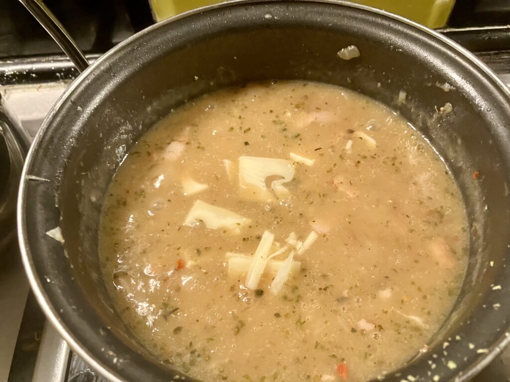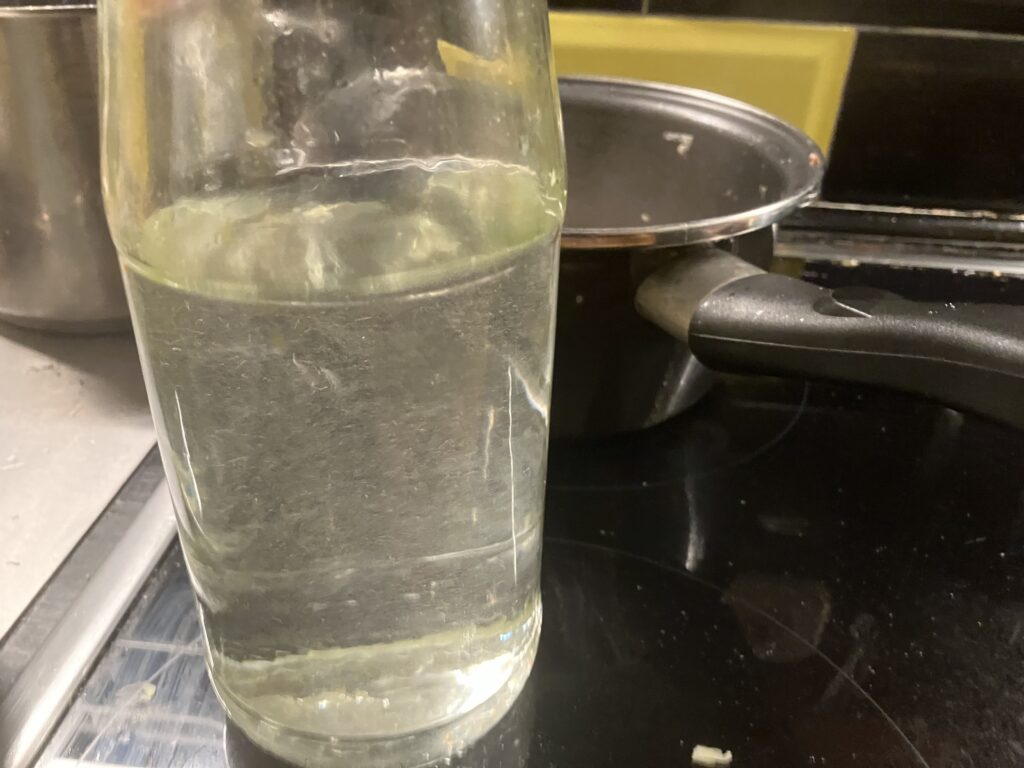 Herd läuft immer noch auf Volldampf, dann den Rest Wasser reinkippen und aufkochen lassen. Das dickt dabei schon wieder an und da müssen wir noch Flüssigkeit nachgießen, bis es irgendwann späte mal auf den Tisch geht.