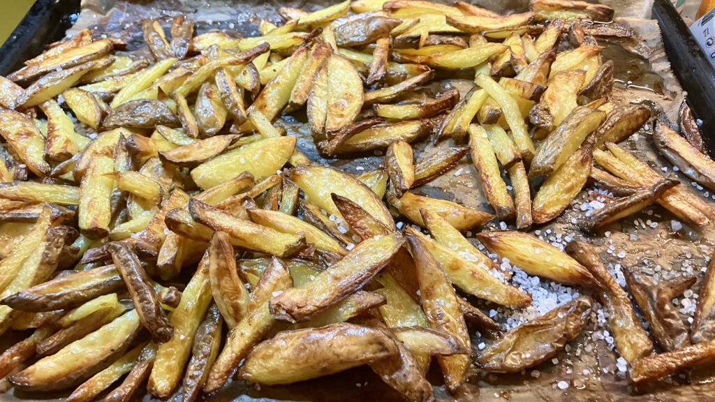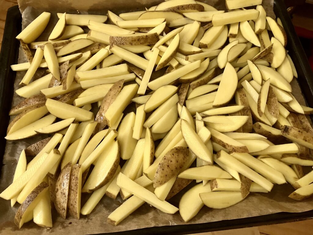 Die Pommes frites kommen in den Ofen und sind unsere Uhr. Die brauchen 45 bis 50 Minuten, dann muss alles andere fertig sein. Schaut Euch bitte das genaue Pommes frites Rezept an.