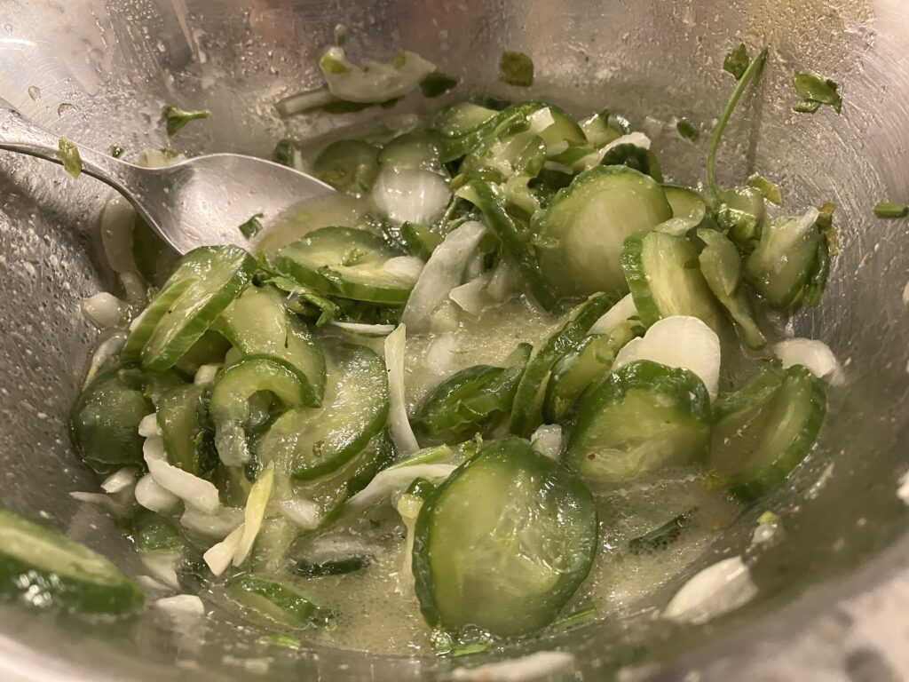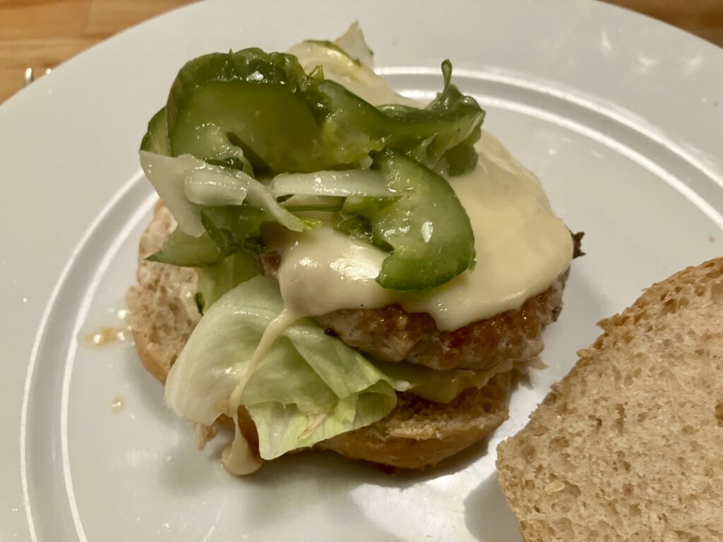 Gurkensalat, für Burger natürlich süß. Den habe ich in diesem Fall auch schon am Vortag zu den Puffern gemacht. Das ist das gute daran, wenn man Dinge gleich so macht, dass sie weitere Verwendung finden.