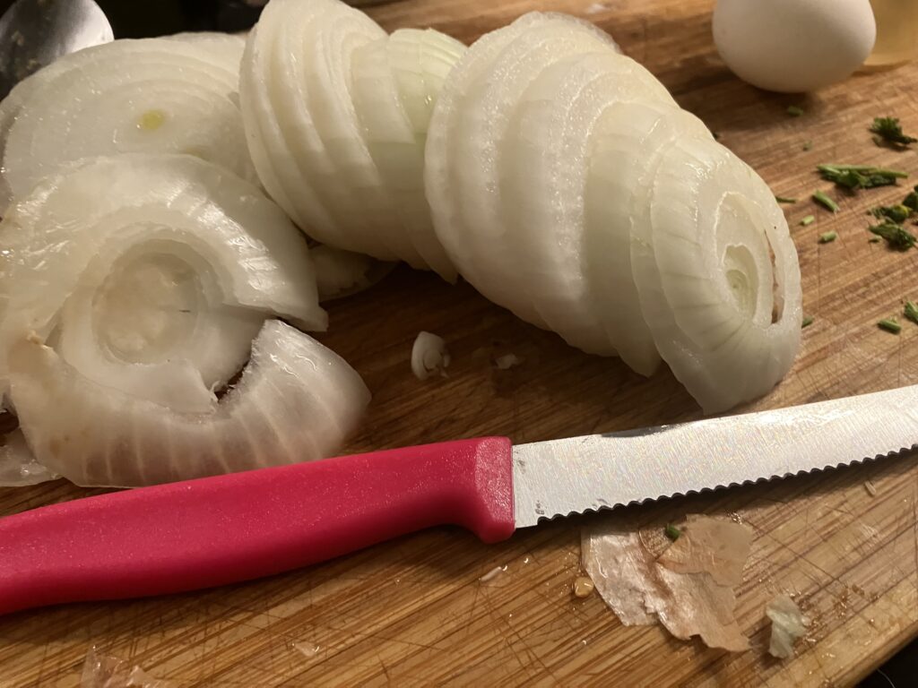 Dann ist mir aufgefallen, dass ich noch keine Röstzwiebeln habe und auch keine fertigen verwenden wollten. Bei der kleinen Menge geht es schnell sowas selbst zu machen. Zwiebel häuten und in Ringe schneiden.