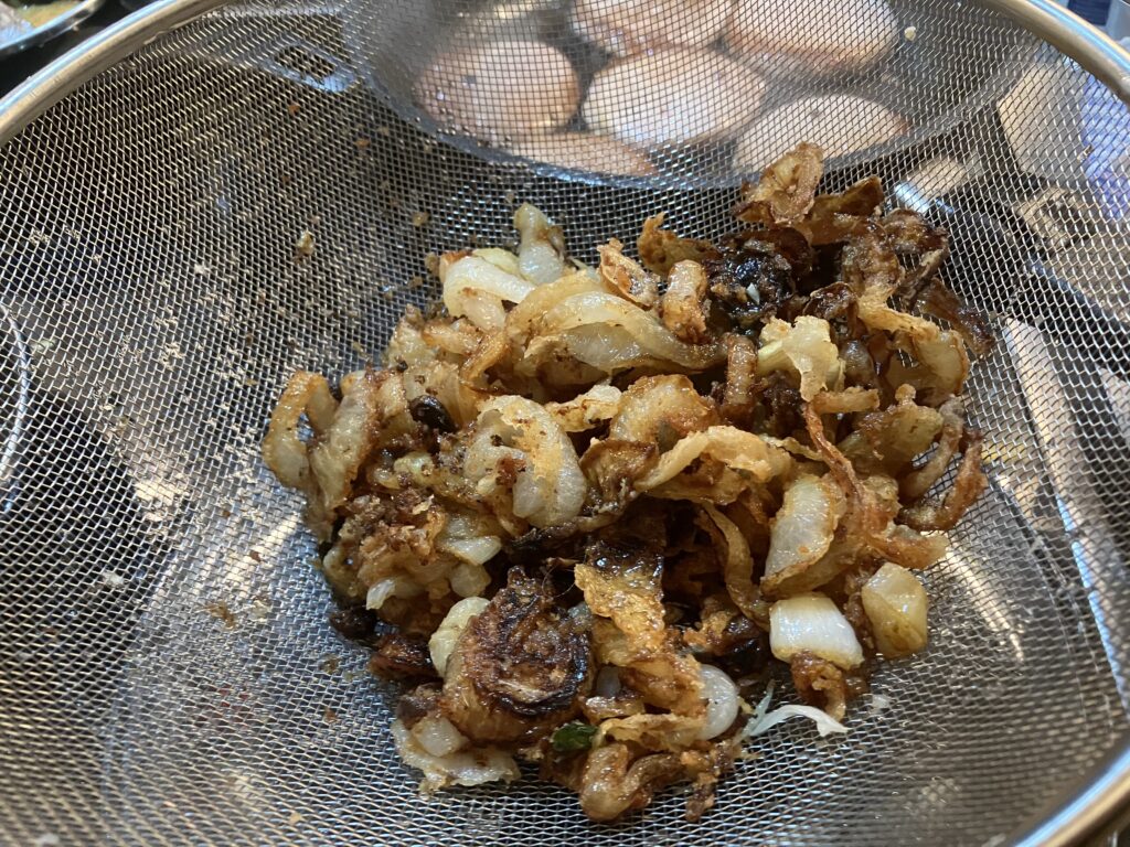 Röstzwiebeln sind fertig. Die tropfen im Sieb ab.