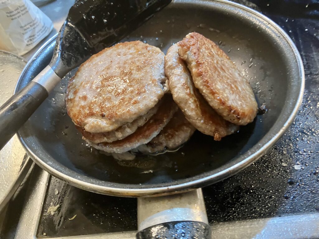 Duke of Berkshire Patties in zwei Durchgängen, mit je 6 Stück á 2 Minuten pro Seite in der trockenen Pfanne braten