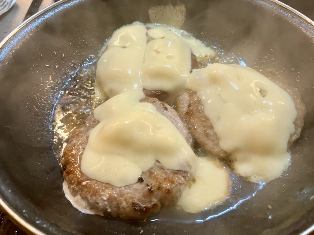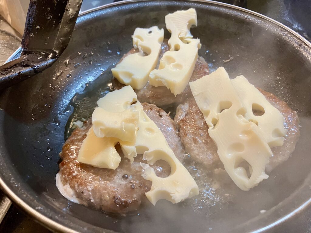 Alle mögen keinen Käse auf dem Burger, ABER für die Menschen am Tisch die es mögen wird jetzt eine Pfanne mit Patties ud Käse zubereitet.