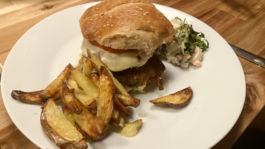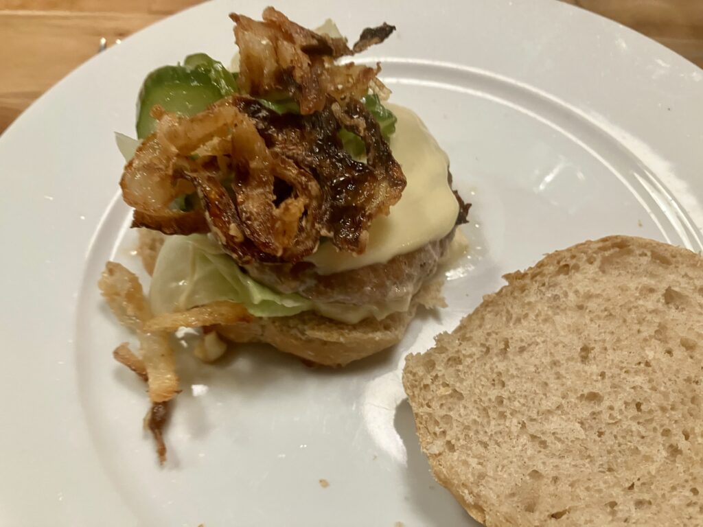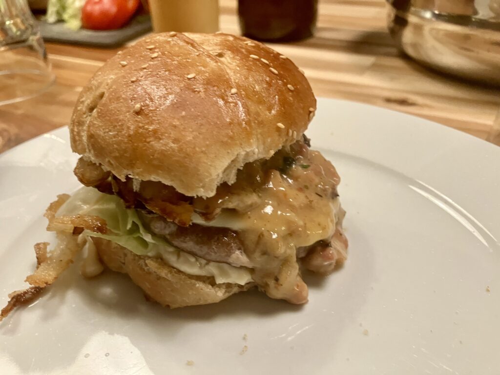Die Burger konnte man sehr gut essen. Einfach fest zusammendrücken. Da war überhaupt kein Gesang am Tisch
