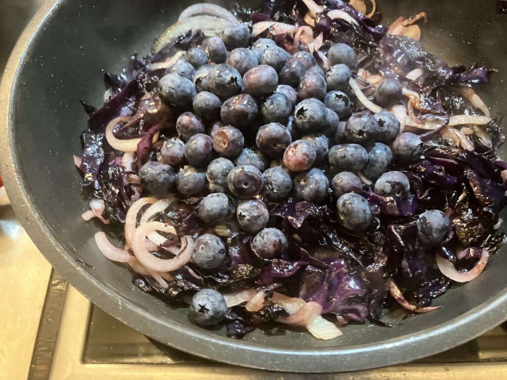 Wenn nach weiteren zehn Minuten die Zwiebeln glasig gebraten sind, kommen die Heidelbeeren in die Pfanne.