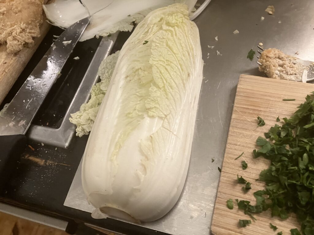 Salz zum Chinakohl geben und so lange kneten, bis Wasser austritt