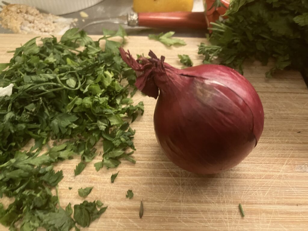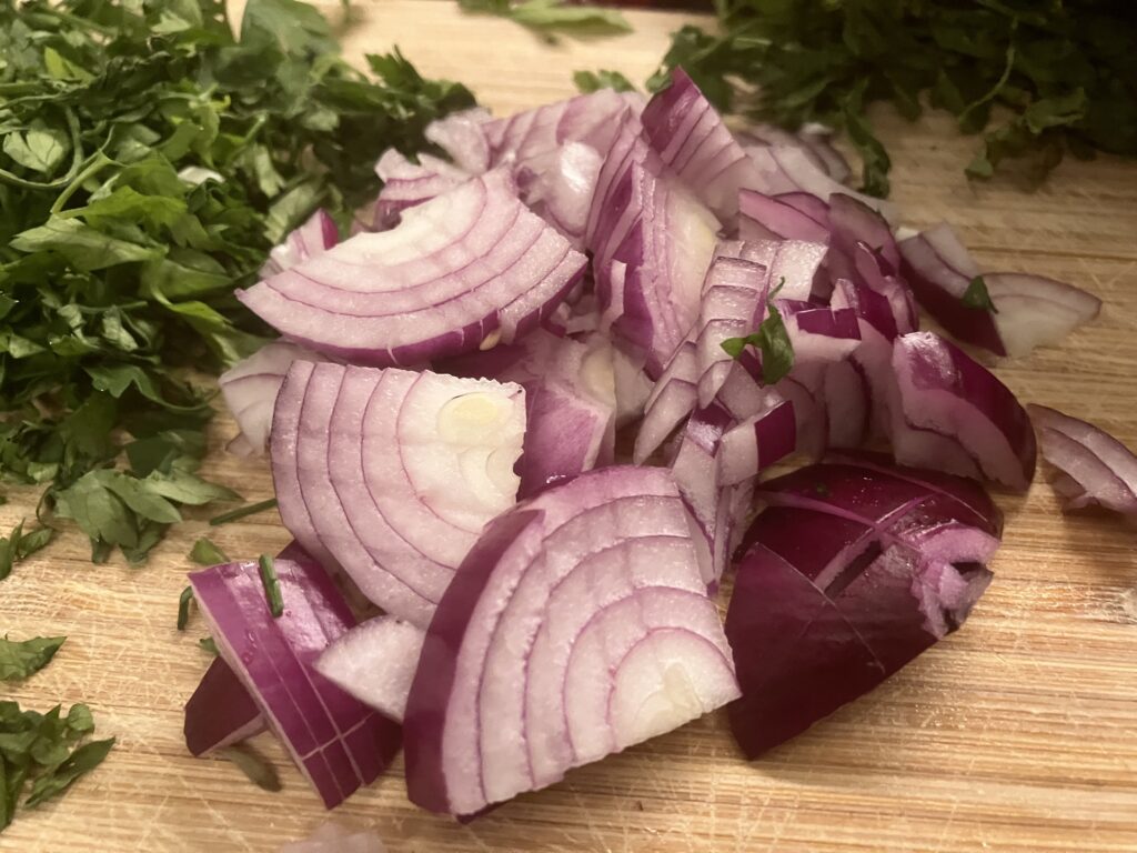 Zwiebel häuten, Petersilie hacken