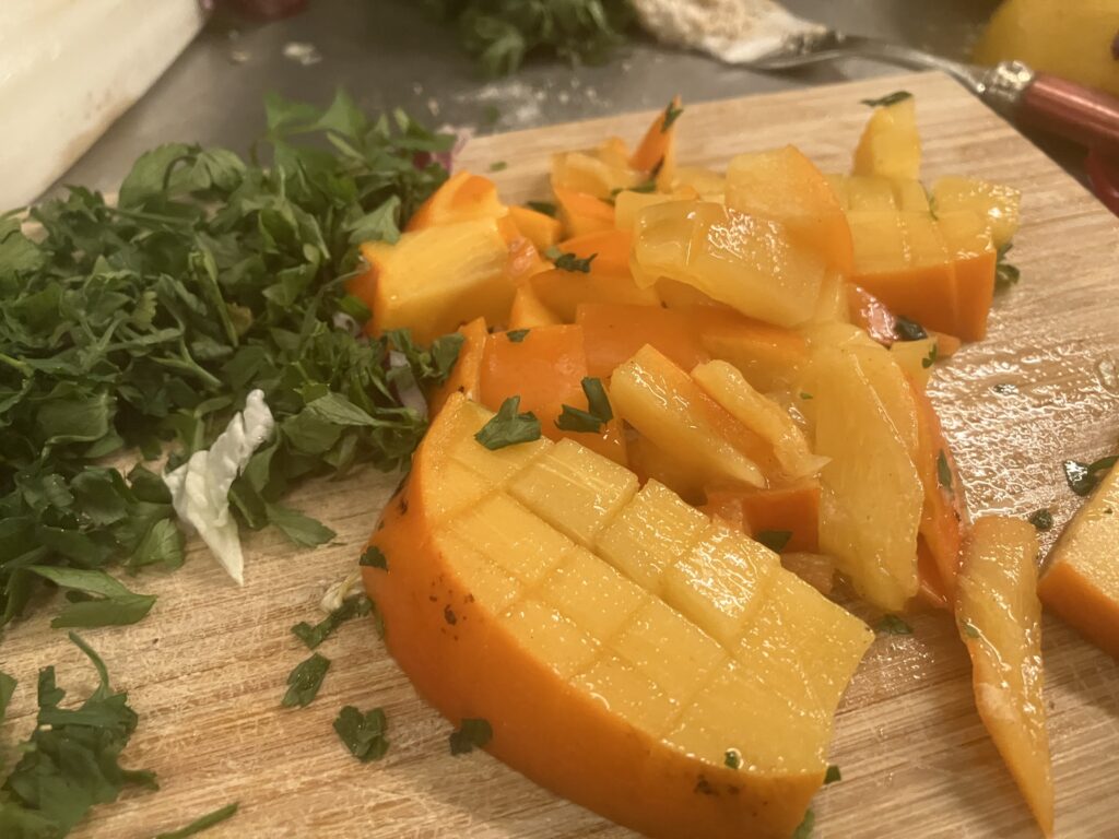 Die Kaki teile ich auf. Eine Hälfte kommt sichtbar in den Salat