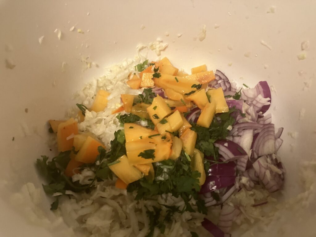 Meine Mutter machte den Chinakohl süß an. Das mochte ich als Kind sehr, gut passend zur Milde und der Knackigkeit des Kohls. Nächstens schau ich, ob eine Kaki oder Persimone zu bekommen ist. Ein guter, leichter Snack auch für den Abend, wenn man vernünftiger Weise nichts mehr zu sich nehmen sollt.