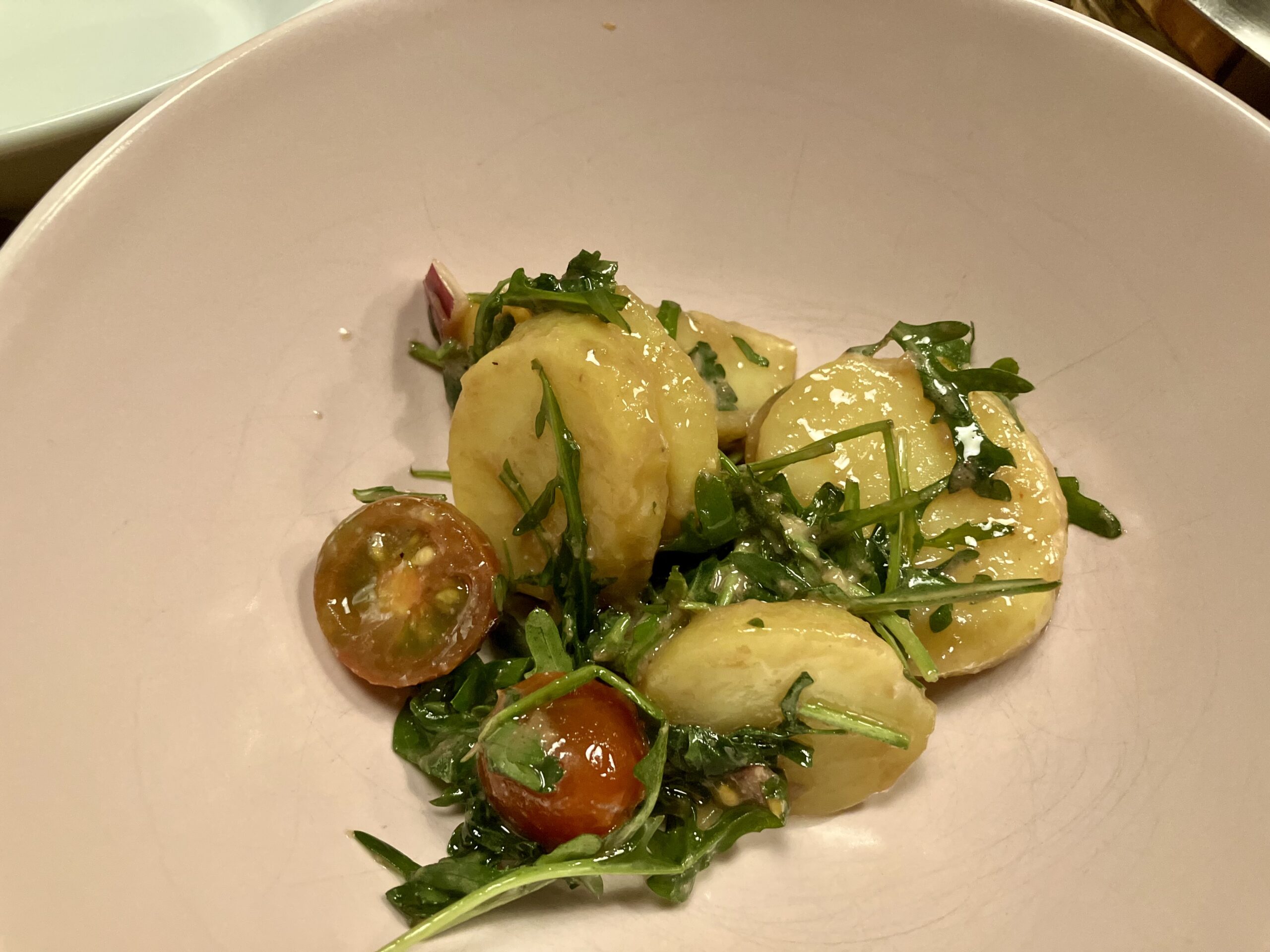 Leider war kein Rucola zu bekommen. Er ist immerhin ein wichtiger Bestandteil. Also machte ich einen hybriden Kartoffelsalat aus diesem Rezept mit Tomaten und dem mit dem Bacon.