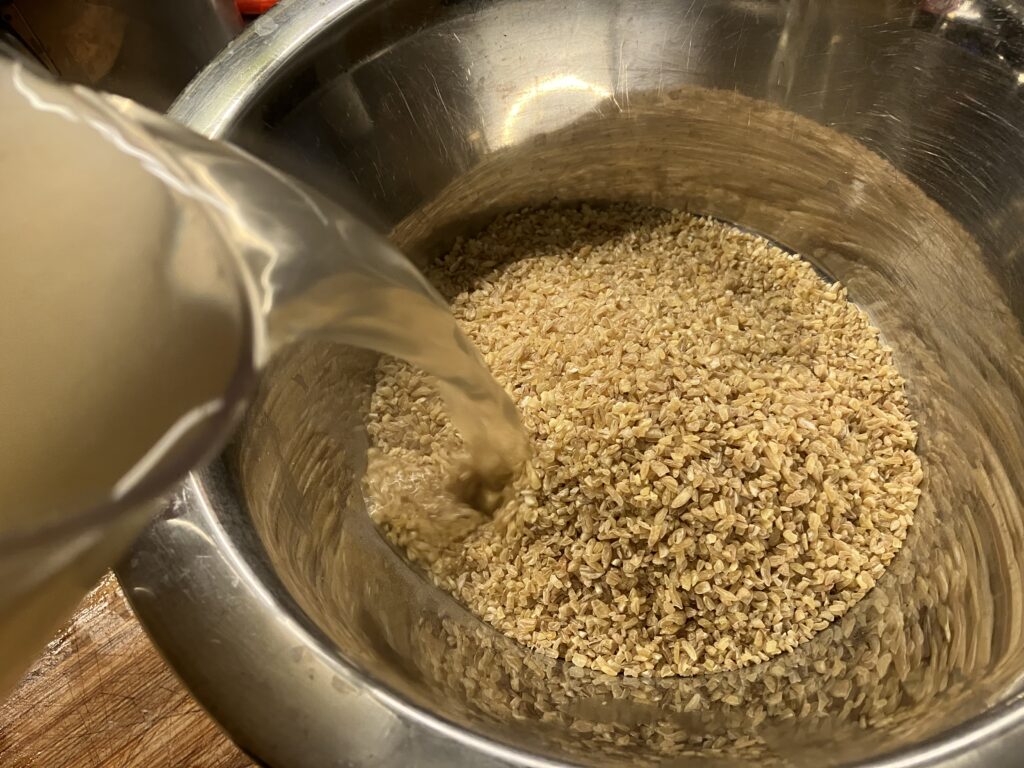 Kochende Gemüsebrühe zum Bulgar gießen und 15 Minuten quellen lassen