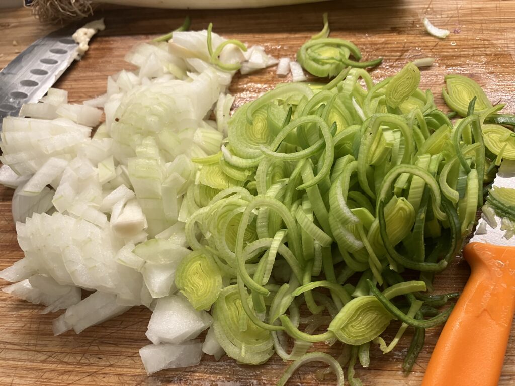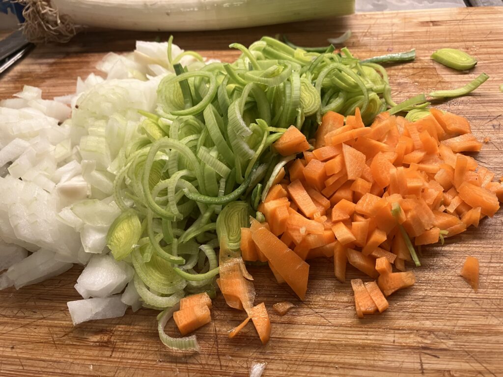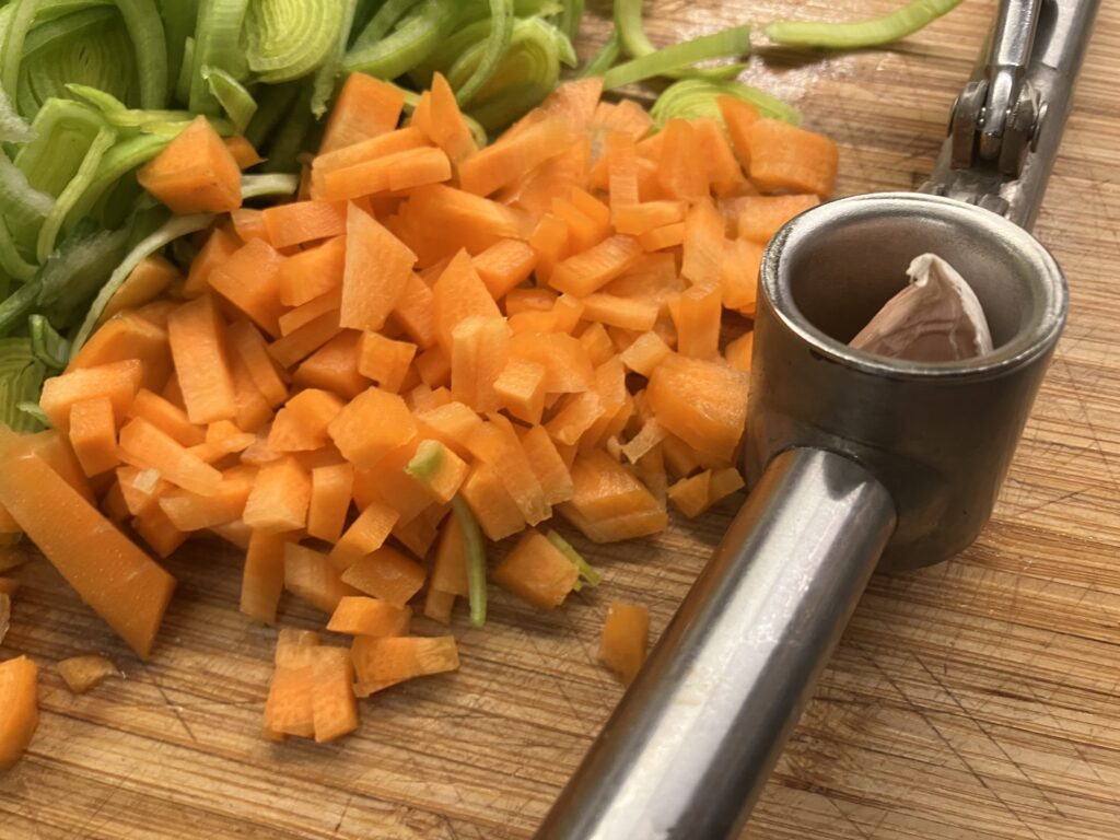 Die Zeit nutzen wir um das Gemüse zu zerkleinern. Den Backofen kann man jetzt auch schon auf 175 Grad Umluft aufheizen
