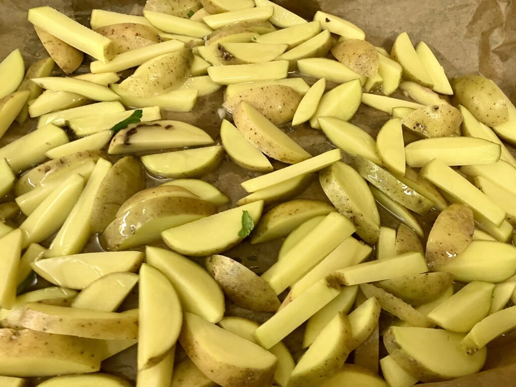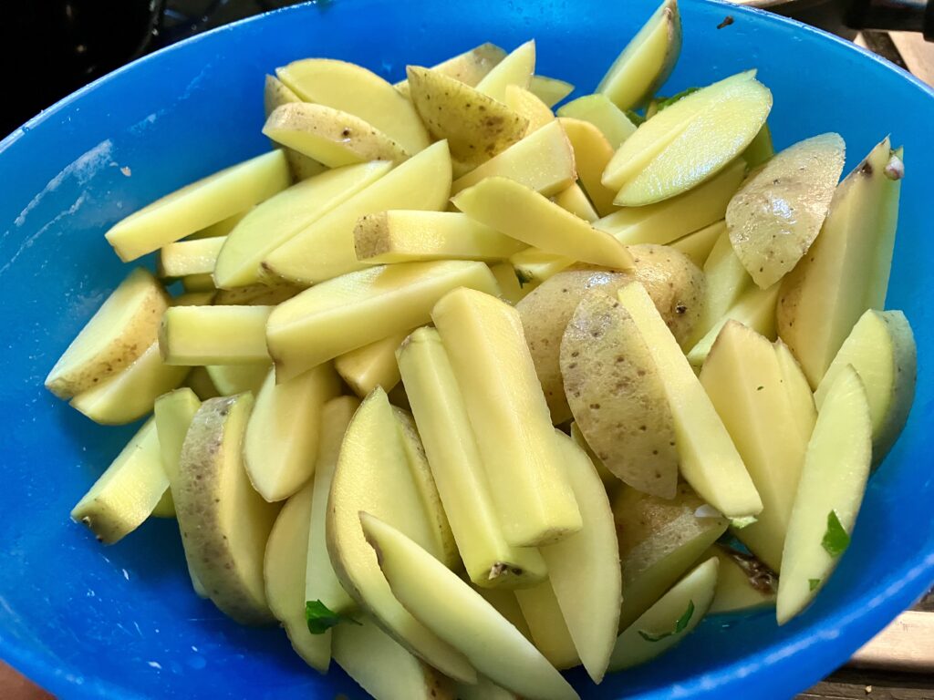 Von der mehligen Lilly hatte ich zwei Säcke mit insgesamt 5 Kilo. Einen Sack habe ich zu Kartoffelklößen verarbeitet. Kartoffelsalat traue ich mich ehrlich gesagt nicht aus einer mehligen Kartoffel zu machen, es sei denn einer von Euch ruft rein, dass das so elementar ist wie zu heiraten, ein Haus zu bauen und Söhne zu zeugen. Auf Pommes frites wäre ich auch nicht automatisch gekommen, aber ich habe das bei Heston Blumenthal gelesen, dass er Pommes frites mit mehligen Kartoffeln macht. Der besingt, bespricht, kocht sie vor und friert sie ein, bevor sie dann am Ende doppelt frittiert werden. Dazu fehlt mir irgendwie die Muße, aber ich habe hier immer strenge Testesser, inklusive einer schwer zu begeisternden Ehefrau. Mit denen kann ich die Probe auf’s Exempel machen, ob es irgendwem aus dem Mund staubt. Es werde Pommes