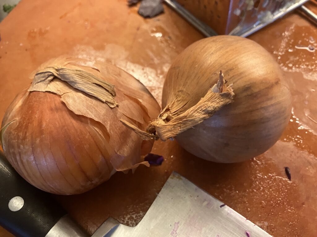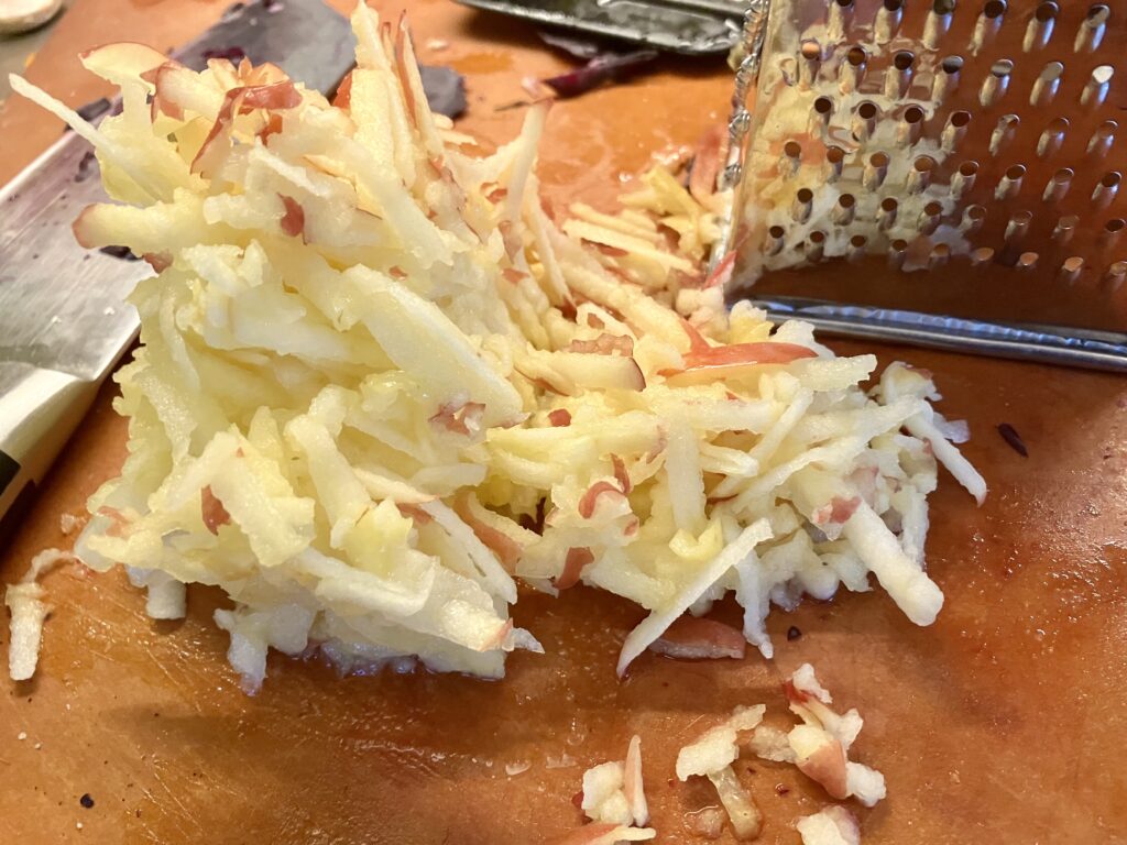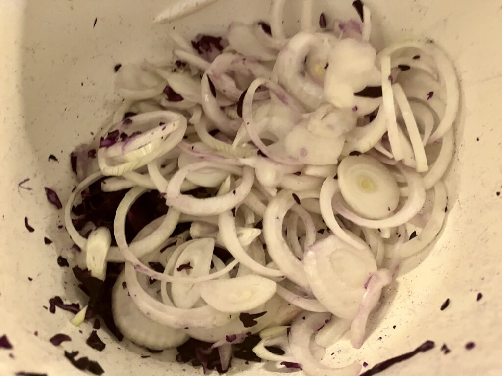 Ich habe den Rotkohl mit der Maschine gehobelt, aber sonst schneide ich den mit dem Messer