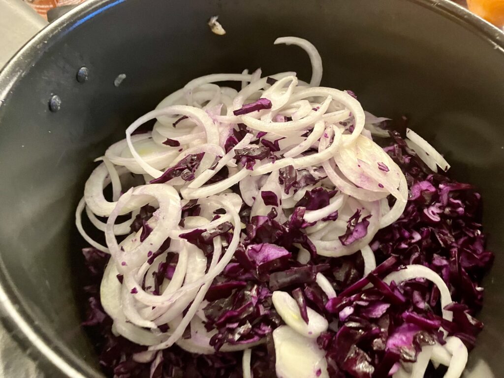 Hier ist der Rotkohl ausgekühlt und den wärme ich nun ein paar Stunden später zum Abendessen wieder an.