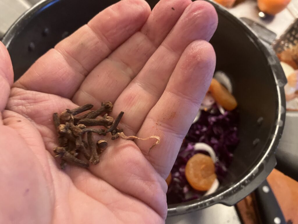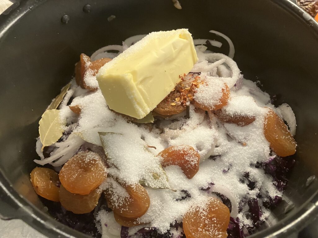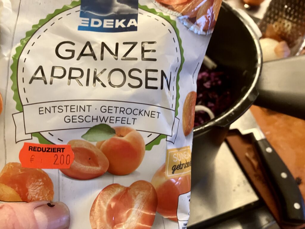 Ich habe im Schrank noch eine Tüte getrocknete Aprikosen gefunden. Die wollte keiner haben, dann sind die genau richtig für einen Rotkohl. Fruchtige Note und Süße passen dazu jedenfalls sehr gut.