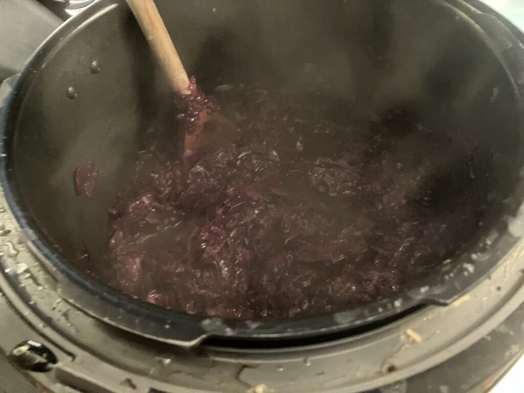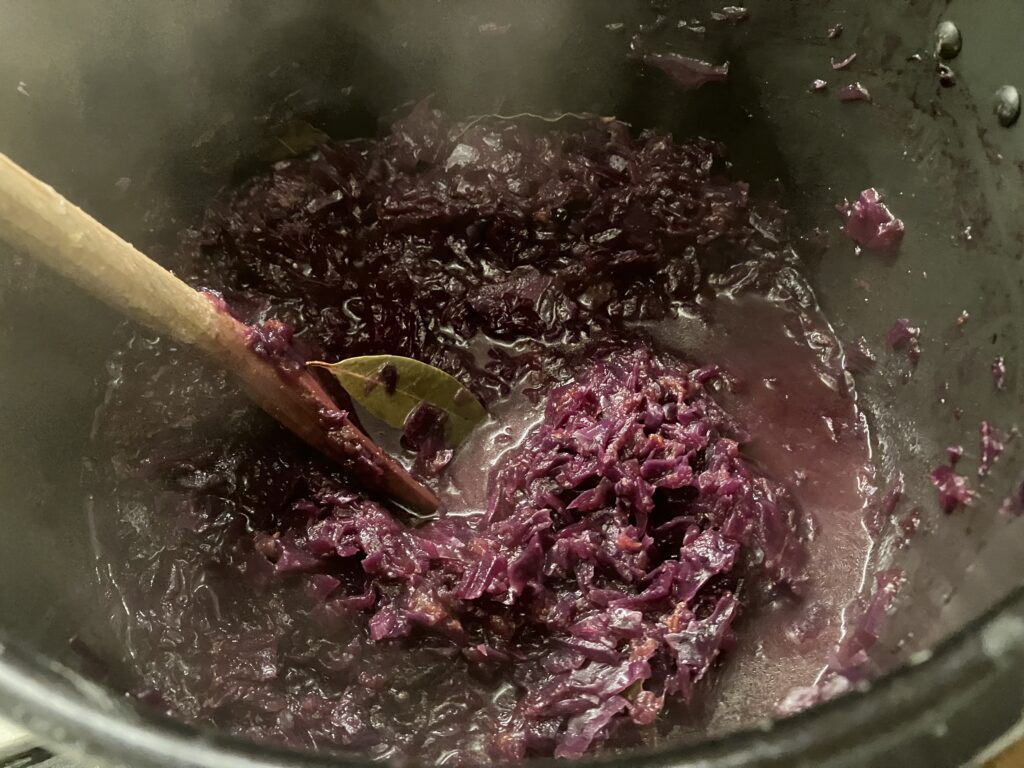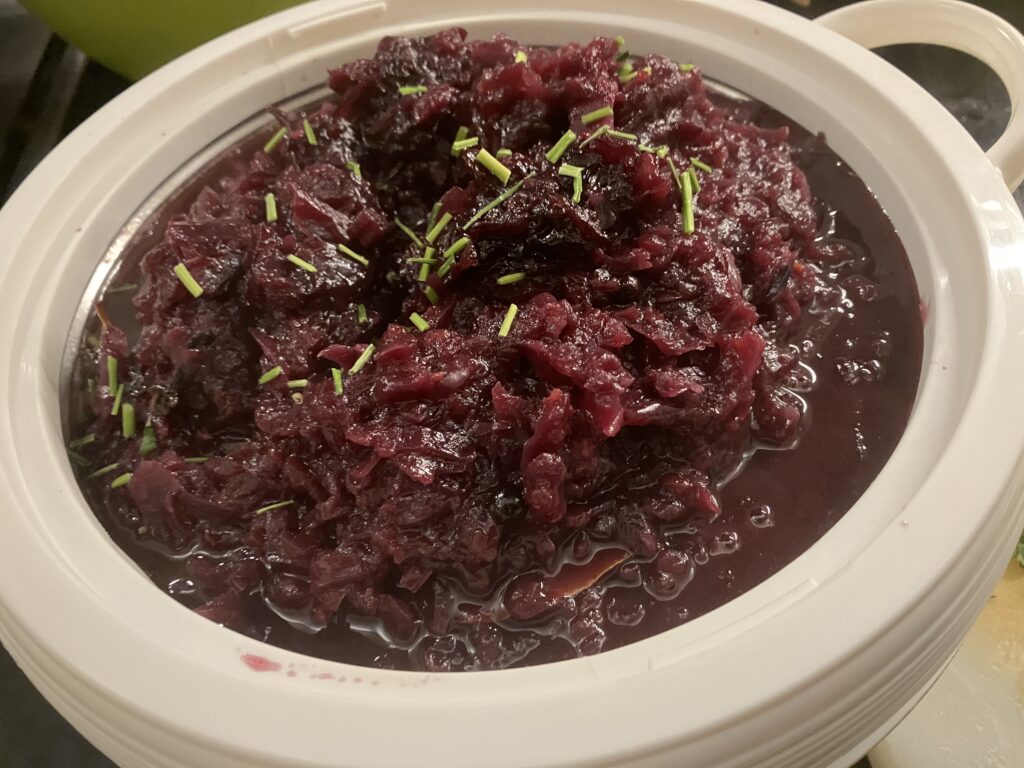 So sieht der Rotkohl aus. Ich lasse den jetzt abkühlen und erhitze ihn später noch einmal. Das hat geschmackliche Gründe und man sagt, dass Rotkohl beim Erwärmen besser schmeckt.