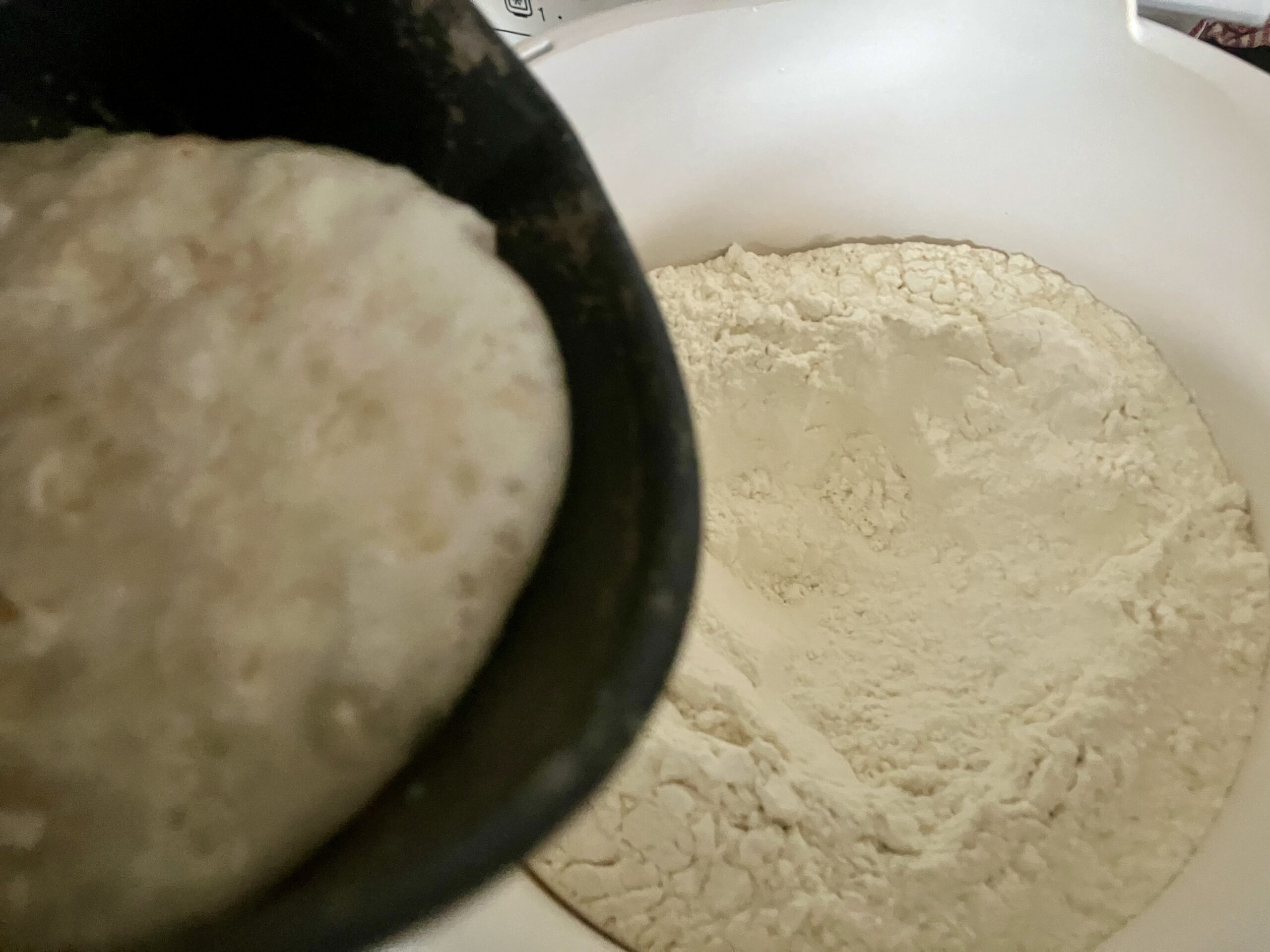 Milch zum Mehl kippen, ich habe extra eine Kuhle hineingedrückt