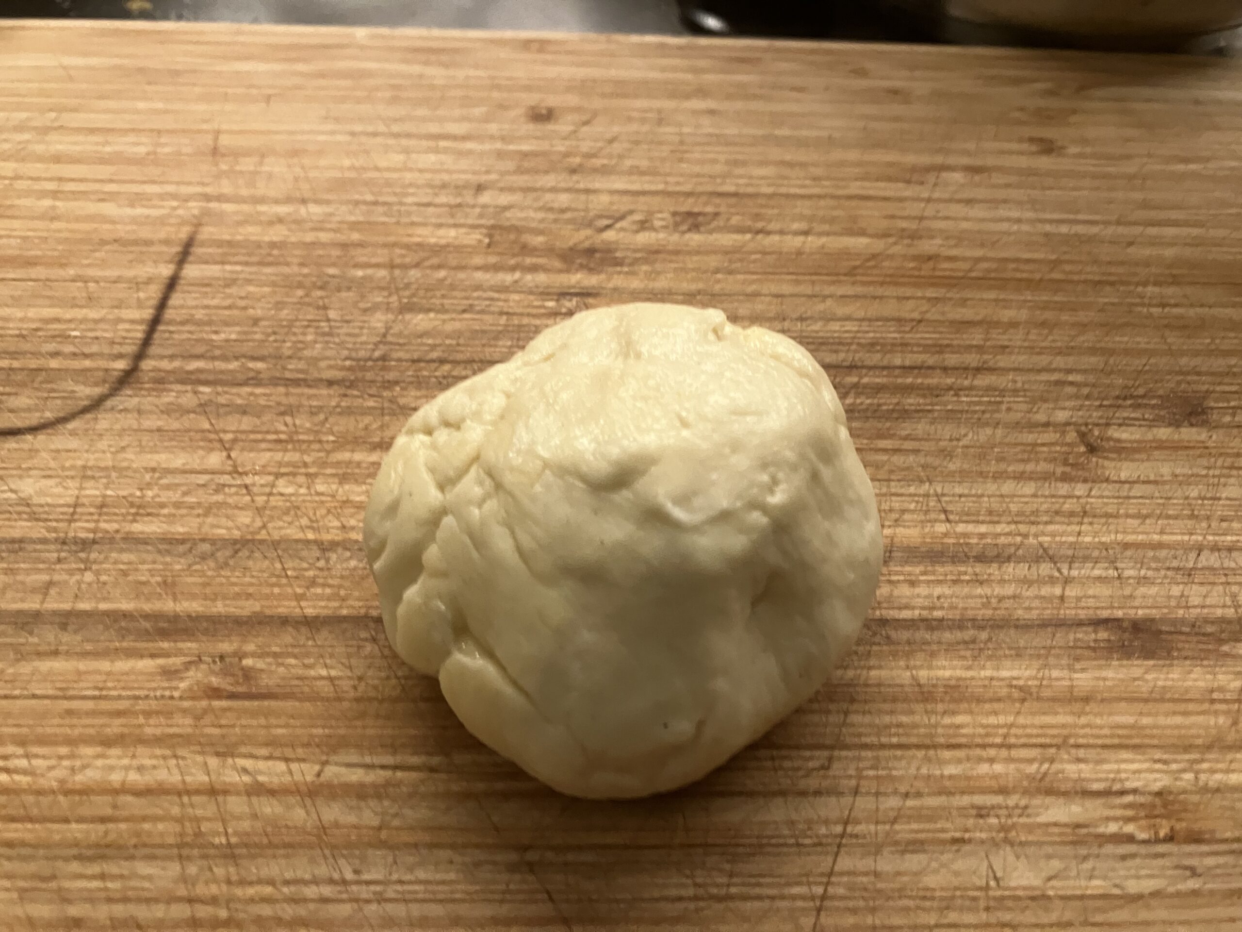 Durch das Einölen klebt der Teig nicht und ich kann den ohne Trennmittel auf dem Brett circa 5 mm dick ausrollen