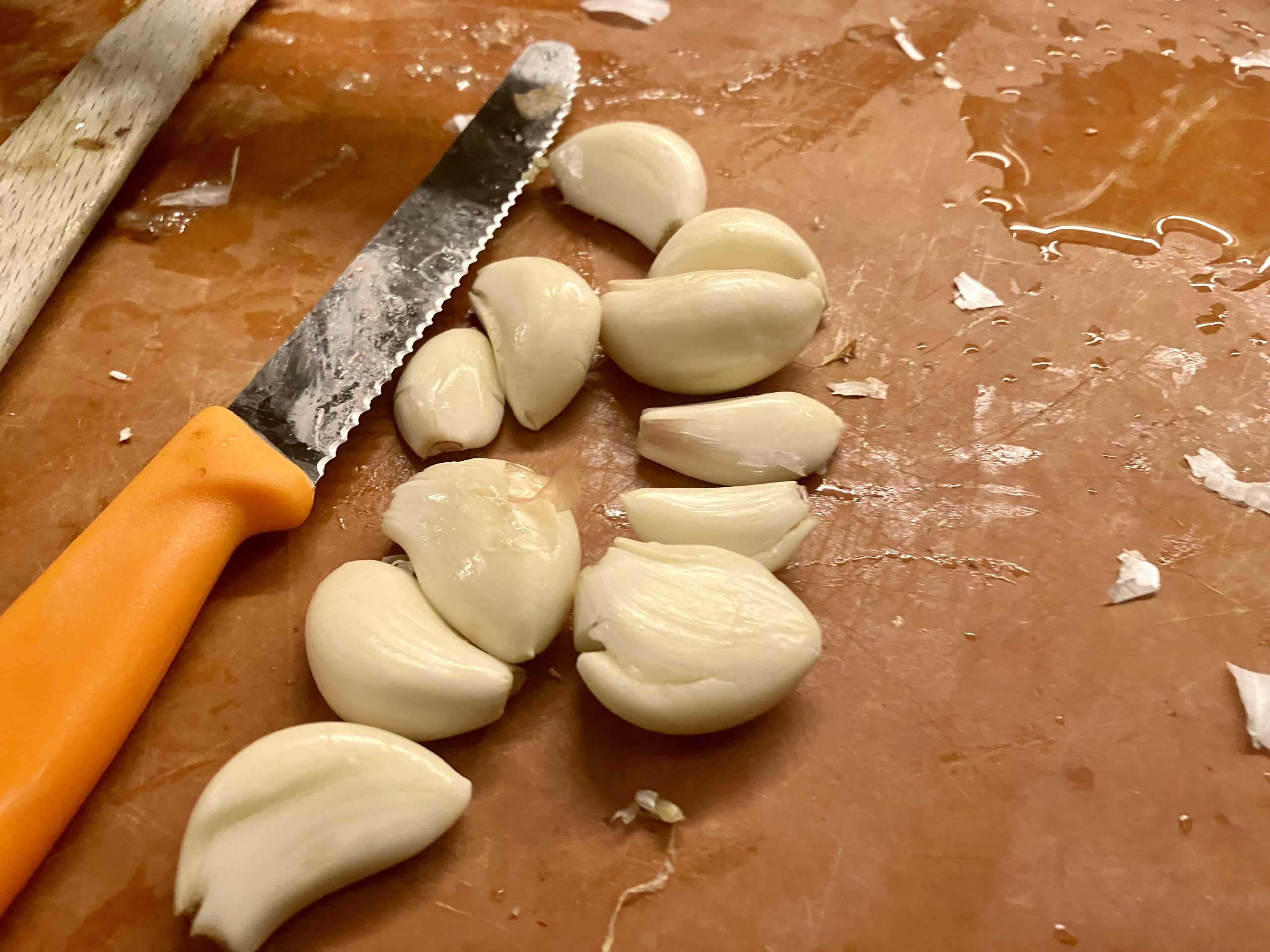 Ich lege mein stumpfes Beil auf die Knoblauchzehen und haue von oben mit dem Handballen drauf.