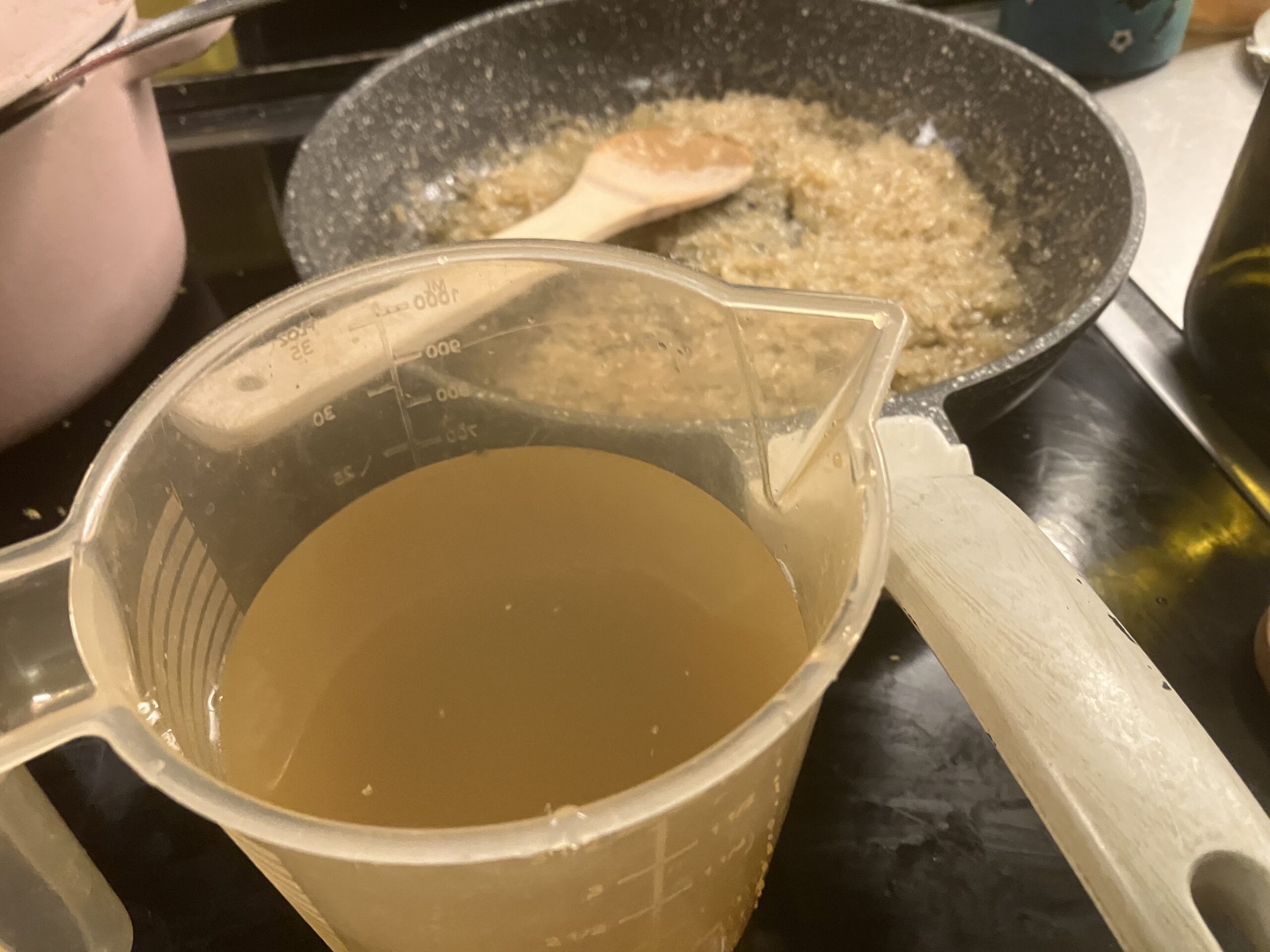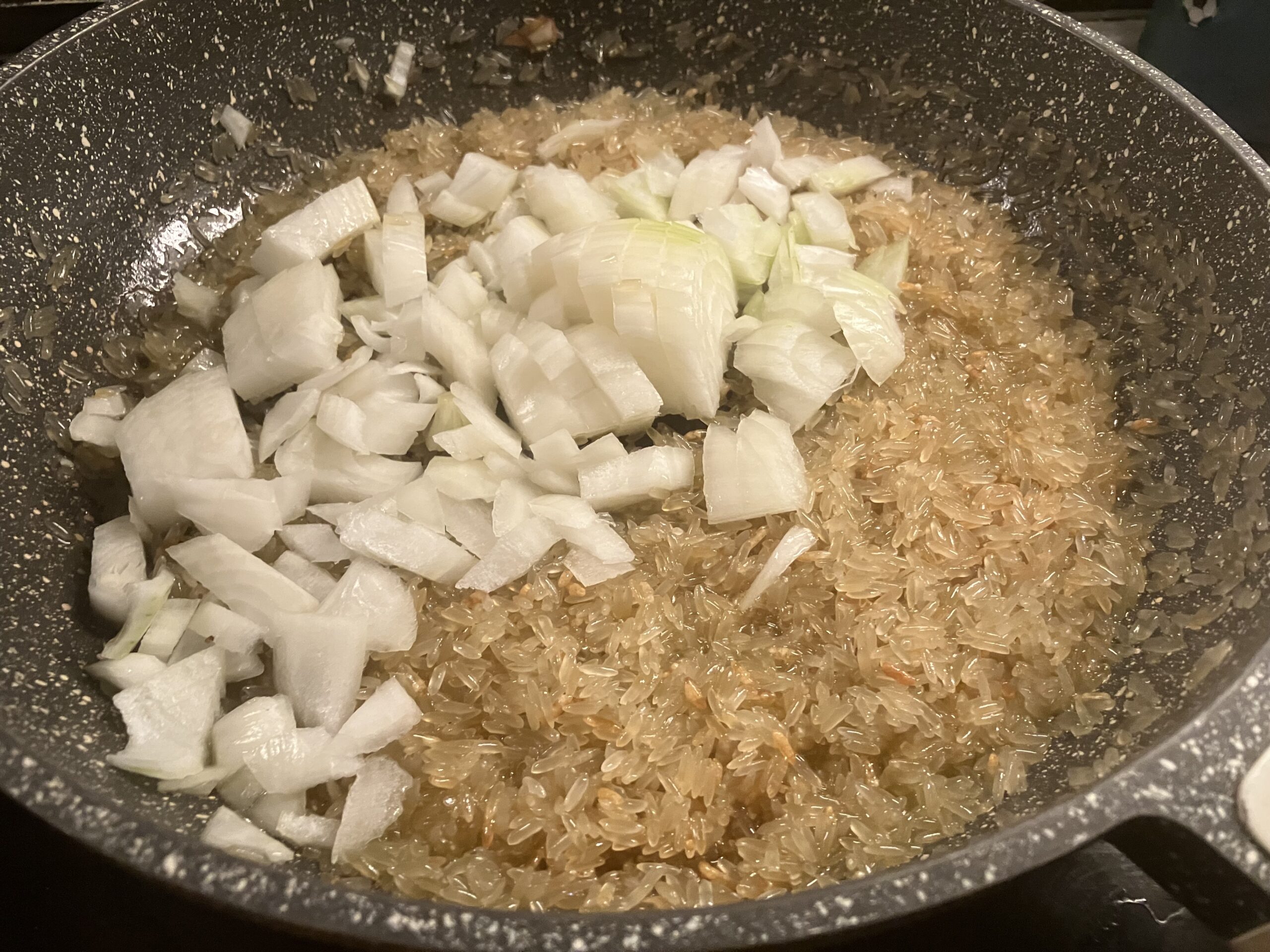 Olivenöl erhitzen und den Reis ins heiße Öl geben. Circa 3 bis 5 Minuten unter gelegentlichem Rühren bei Vollgas anbraten