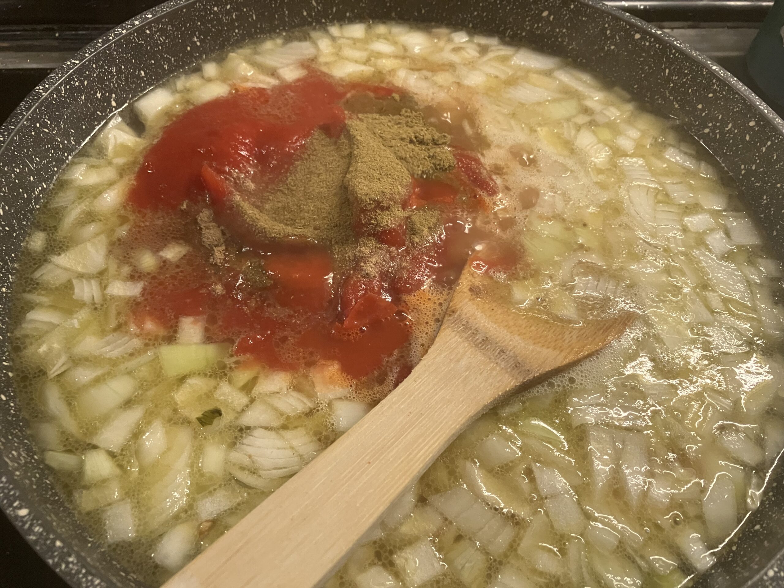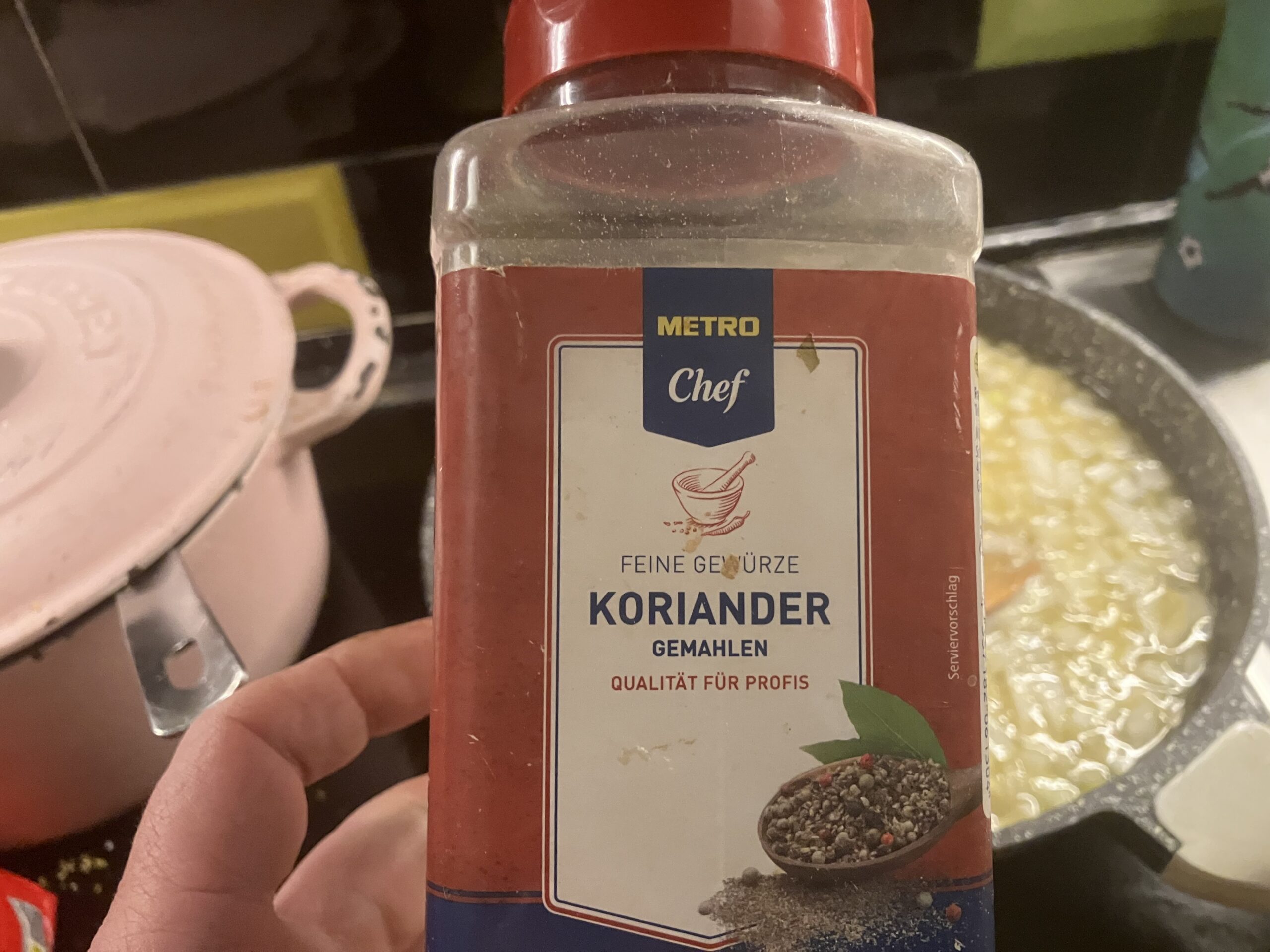 Koriander, Kreuzkümmel, Kurkuma, Oregano, Chiliflocken, Oregano. Meine Brühe ist immer so salzig, dass ich erstmal nicht extra Salz hinzufüge