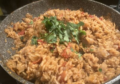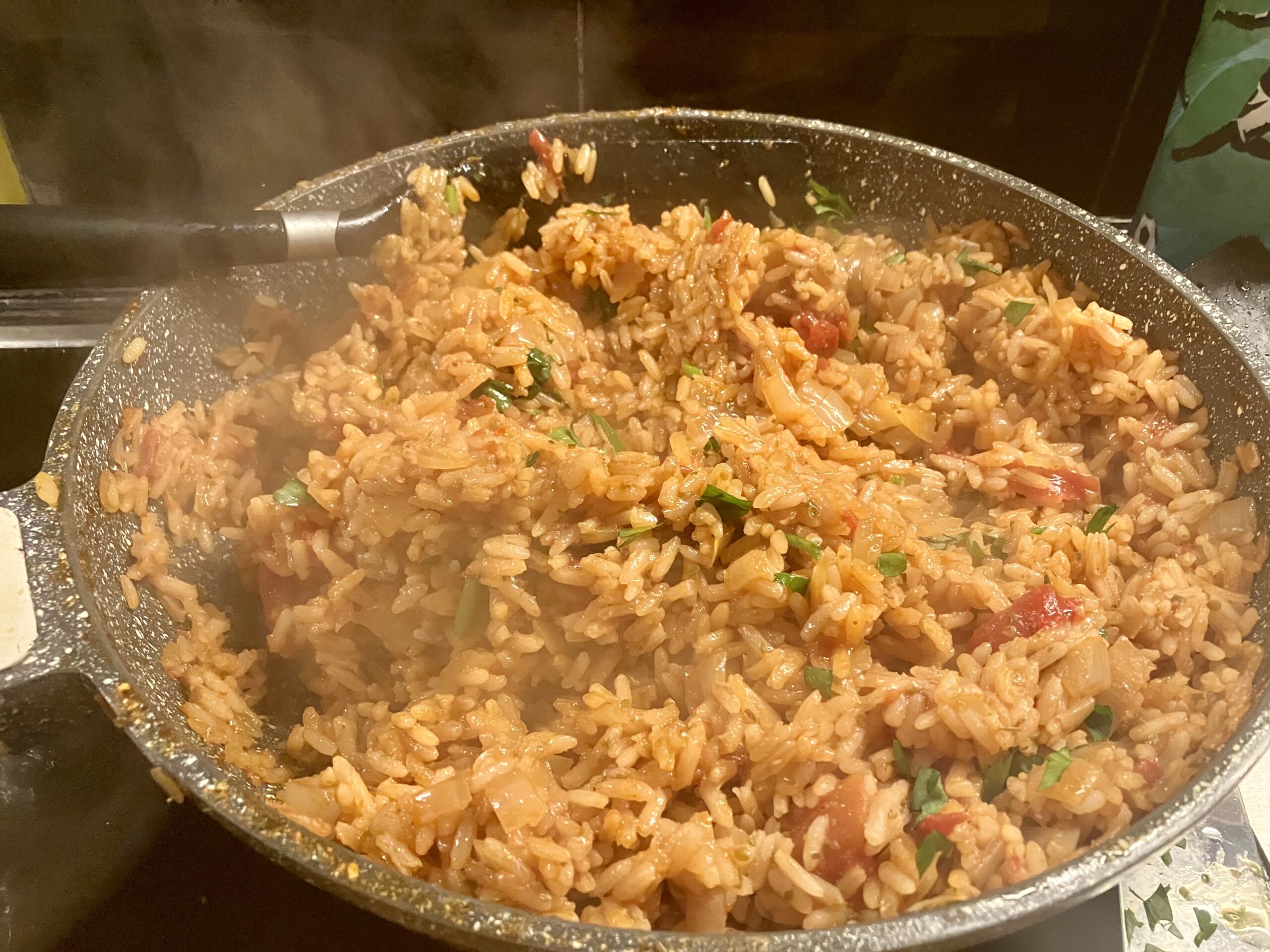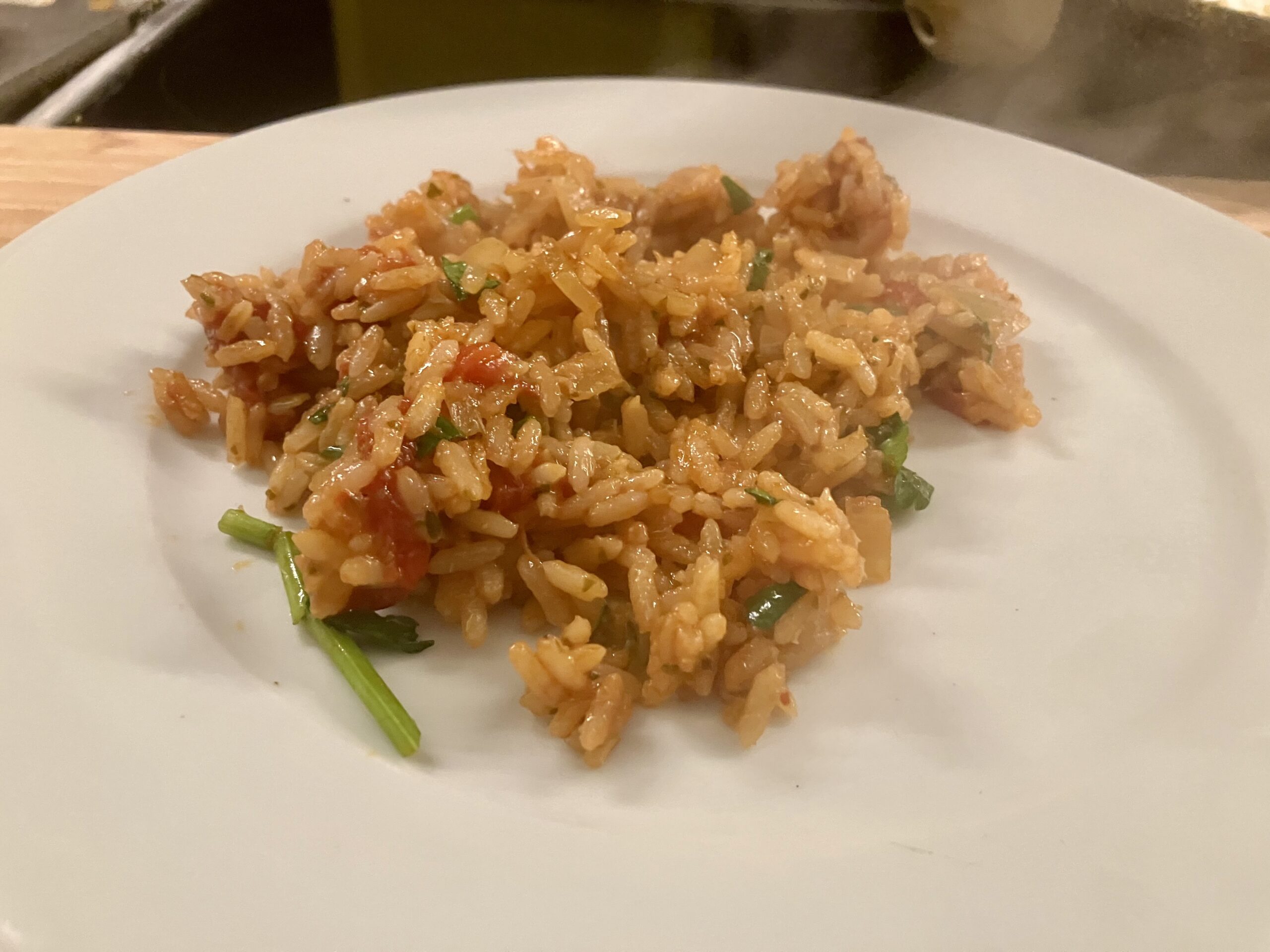 Ich wühle mich gerade ein bisschen durch Texmex Fast Food und als ich irgendwann in Kalifornien auf Hochzeitsreise war, bin ich dort immer gerne zu “El Pollo loco” gegangen. Das ist eine Kette, die es ebenfalls nicht überall in den USA gibt, sondern vor allem in Kalifornen, Texas und den Südstaaten. Dort haben mir die Hähnchenteile vom Gasgrill immer besonders gut gefallen und retrospektiv ist es natürlich auch lustig, was man damals als Gringo scharf empfand. Ich habe in einem Anfall von Nostalgie jedenfalls ein bisschen recherchiert und fange standesgemäß mit einer sättigenden Beilage an, mexican rice. Der hat natürlich diesen leicht muffigen Koriander- und Kreuzkümmelgeschmack und als Besonderheit wird der erstmal angebraten, bevor er in Brühe geköchelt wird. Wenn man nicht so in dem Kochthema ist, kann man hier auch noch etwas kochtechnisches lernen.