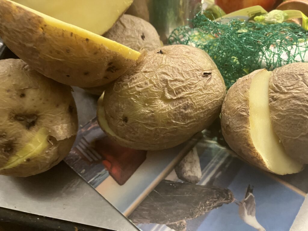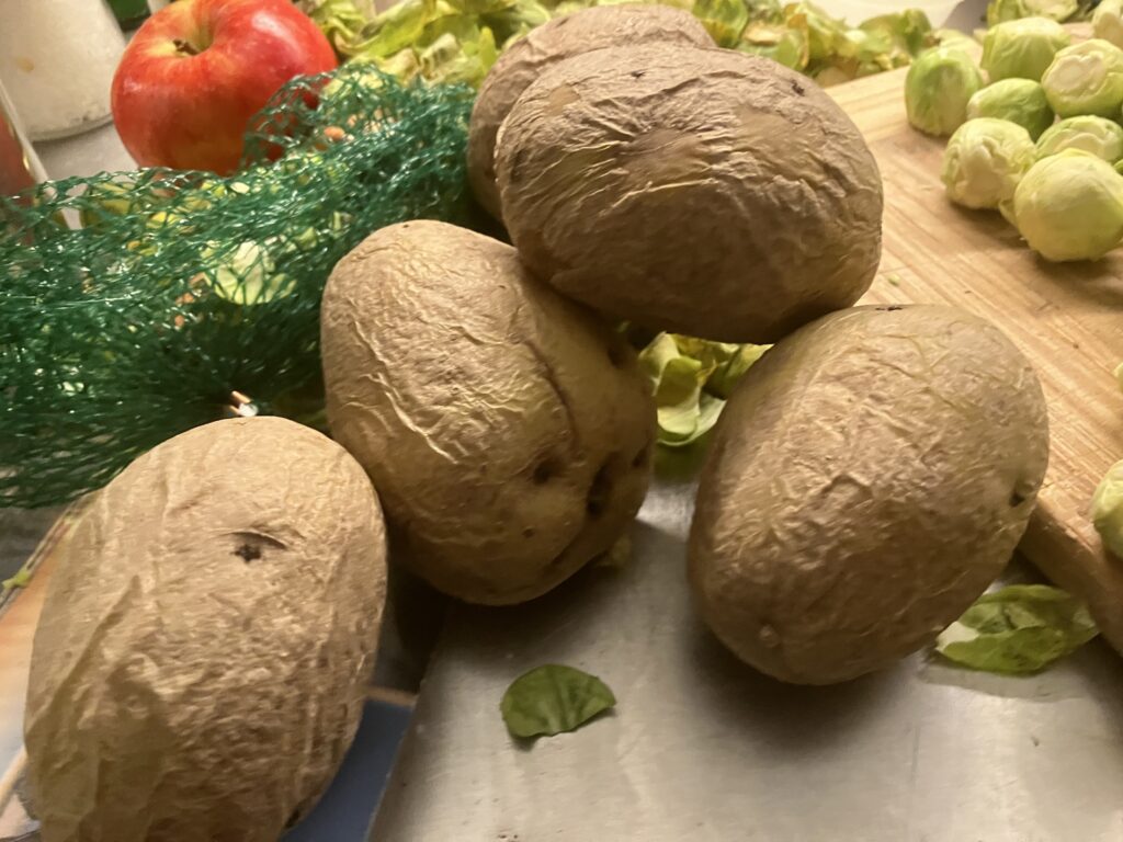 Die Kartoffeln habe ich am Vortag drei MInuten unter Druck gekocht, damit sie bis zum nächsten Tag resistente Stärke bilden, die den Blutzucker nicht so hochtreibt wie eine frisch gekochte Kartoffel. Weiterer Vorteil ist, dass die jetzt schon gar ist und egal wie ich sie jetzt anwärme, kann sie innen nicht mehr roh sein.