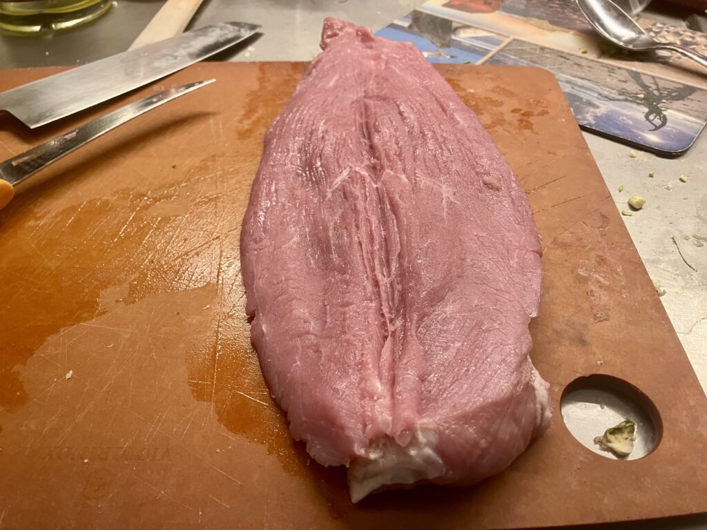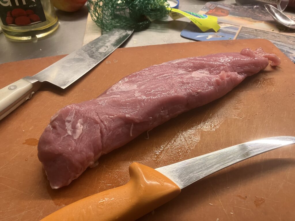 Das Fleisch bereite ich jetzt vor. Das ist Schweinefilet vom Handelshof. Das habe ich im MHD Verkauf für sechs Euro pro Kilo bekommen. Die Familie isst gerade so schlecht Fleisch, dass ich nur 500 Gramm davon verwendet habe. Irgendwer ist immer nicht da, oder krank, oder will kein Fleisch