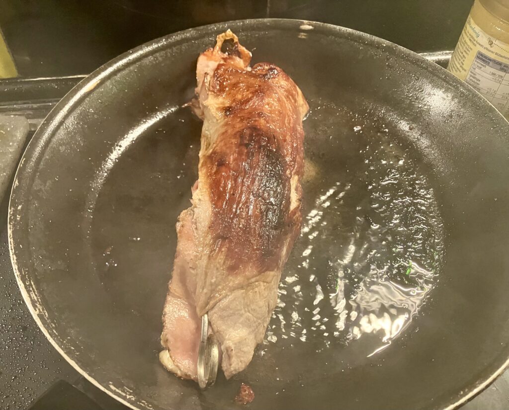Fleisch ist nach 12 MInuten einmal rundherum angebraten und darf noch ein bisschen in Alufolie ruhen