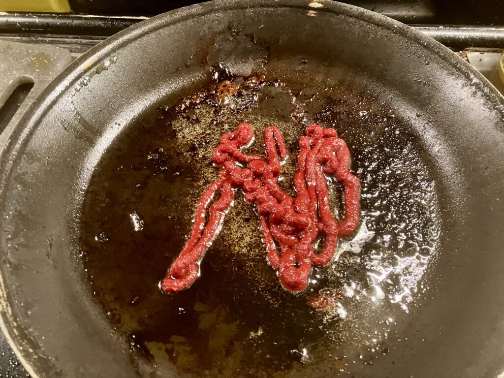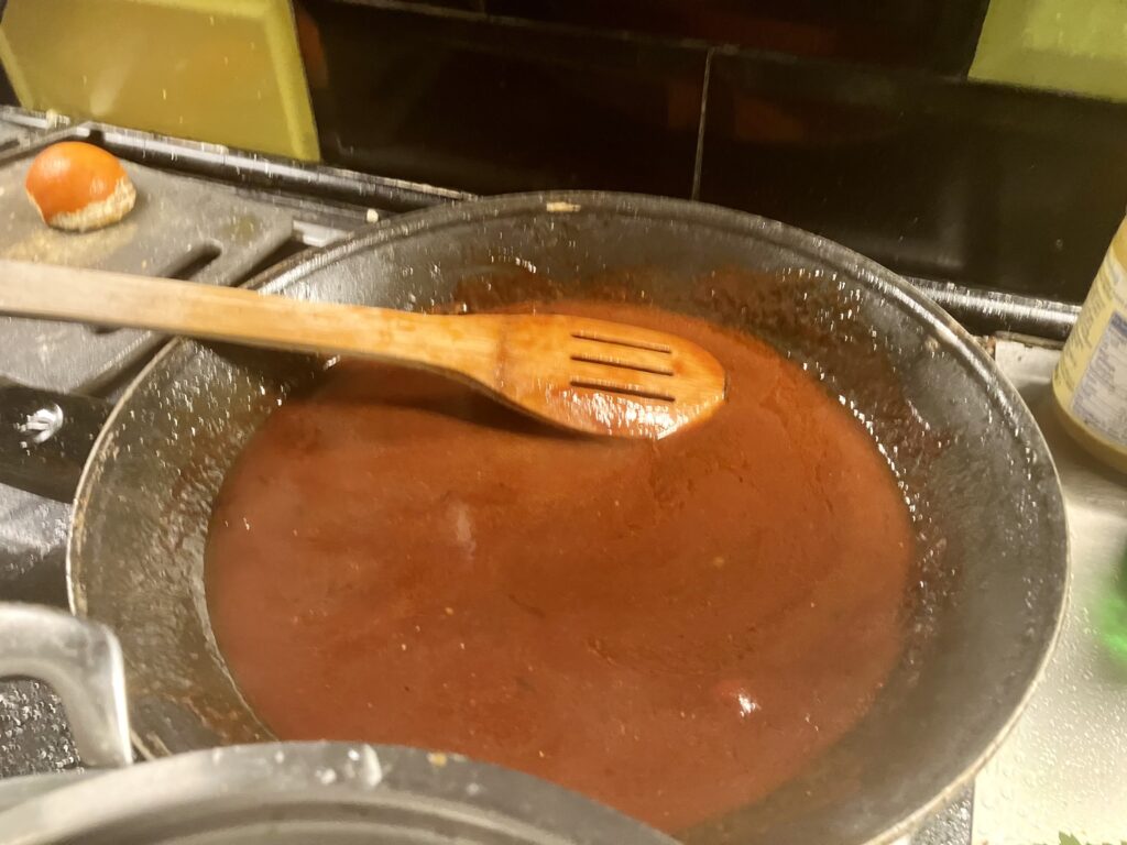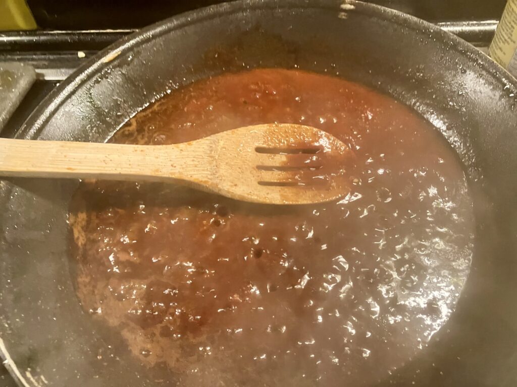 Tomatenmark in die Pfanne geben und auf Vollgas stellen. Das Fett ist vom Braten