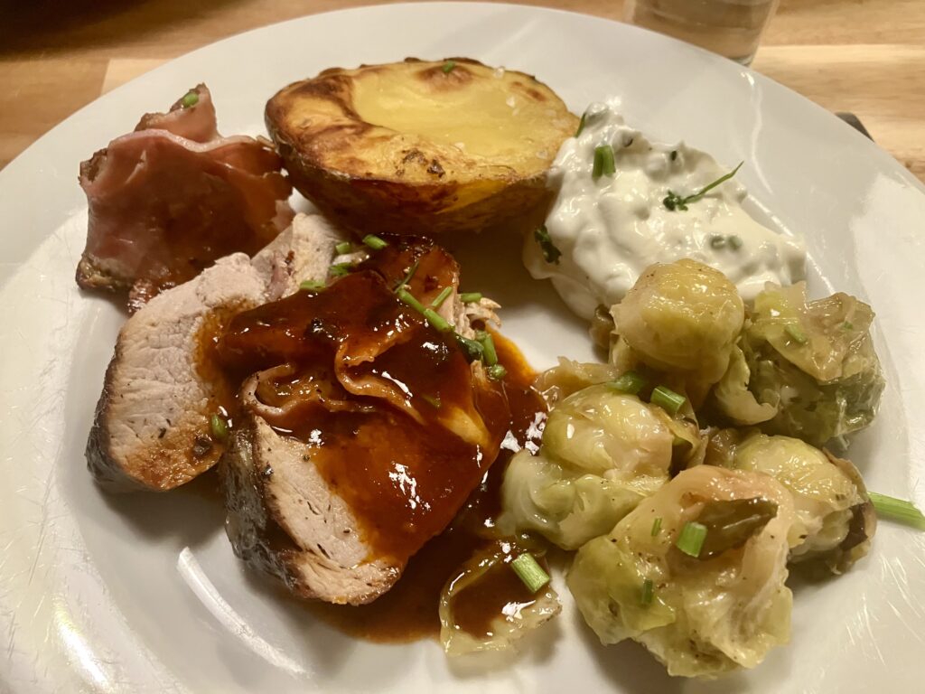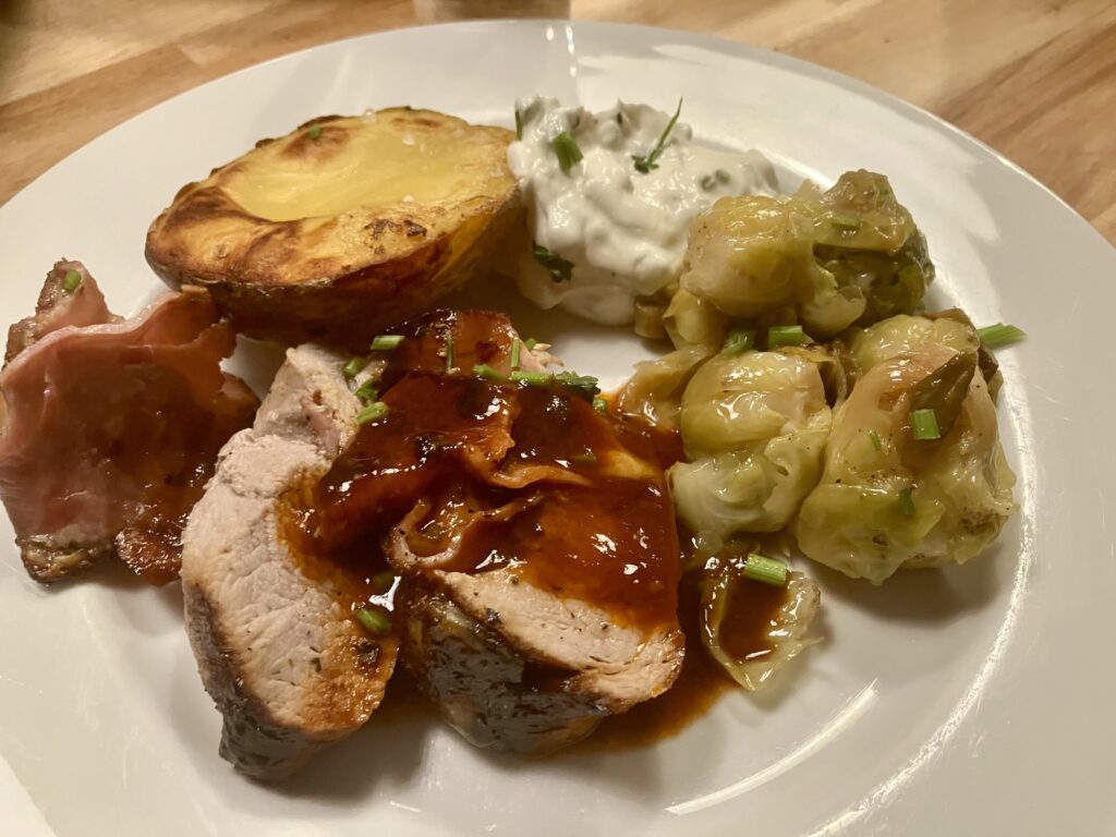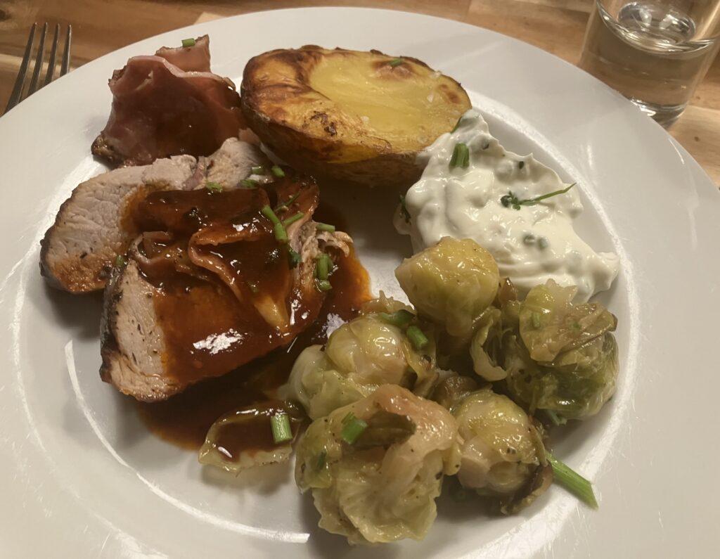 Das ist ein Gericht für die Woche und auch am Wochenende, wenn man nicht so richtig viel Lust zu kochen hat, oder wenn es an Zeit fehlt. Deswegen soll man aber trotzdem immer maximal gut essen und wenn ich keine Lust habe, dann bin ich trotzdem noch bereit eine Stunde zu investieren. Die braucht man hier aber nicht. Knusprige Kartoffeln, leckerer Rosenkohl und ein gefülltes Schweinefilet mit einer Weinsoße, die sich vom Bratensatz ableitet. Das ist eine richtige Belohnung für den Tag und einer meiner Favoriten, wenn ich mir das aussuchen kann.