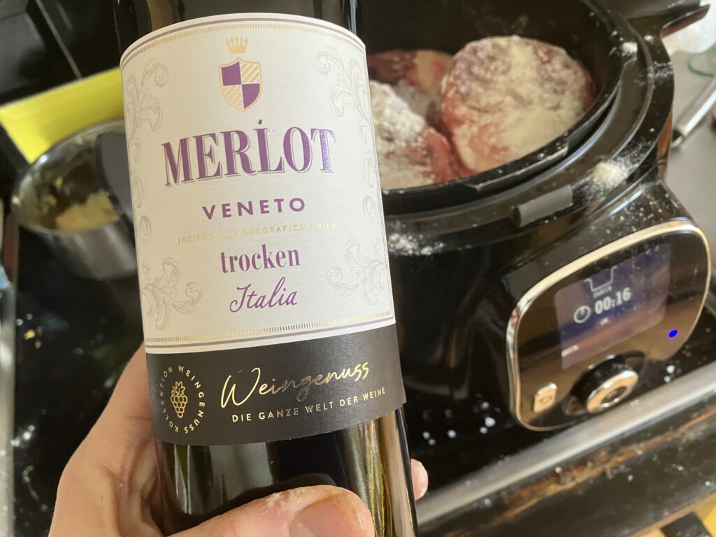 Ich hatte gerade eine Flasche trockenen Rotwein zur Hand, aber stilechter und besser wäre eine Flasche trockener Weißwein. Believe me, it’s for your own protection.