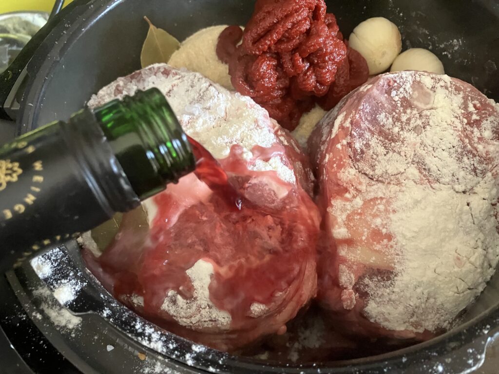 Das Tomatenmark ein bisschen mit dem Wein verrühren notfalls noch 200 Milliliter Wasser dazugeben