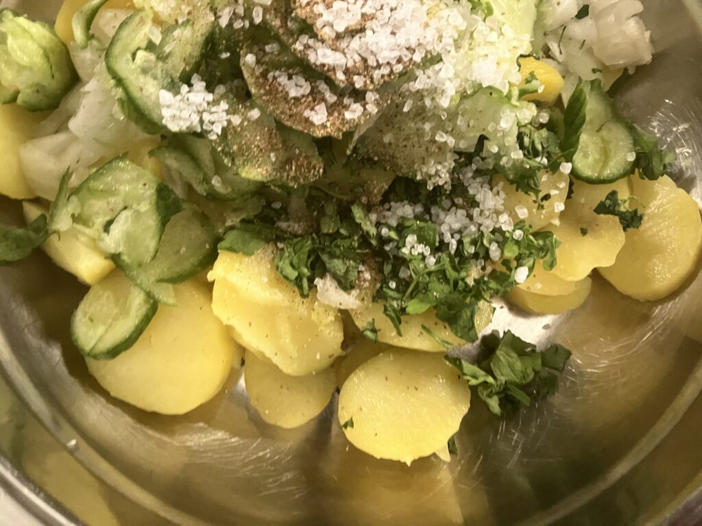Zwiebel, Petersilie und Gurke zu den Kartoffelscheiben geben