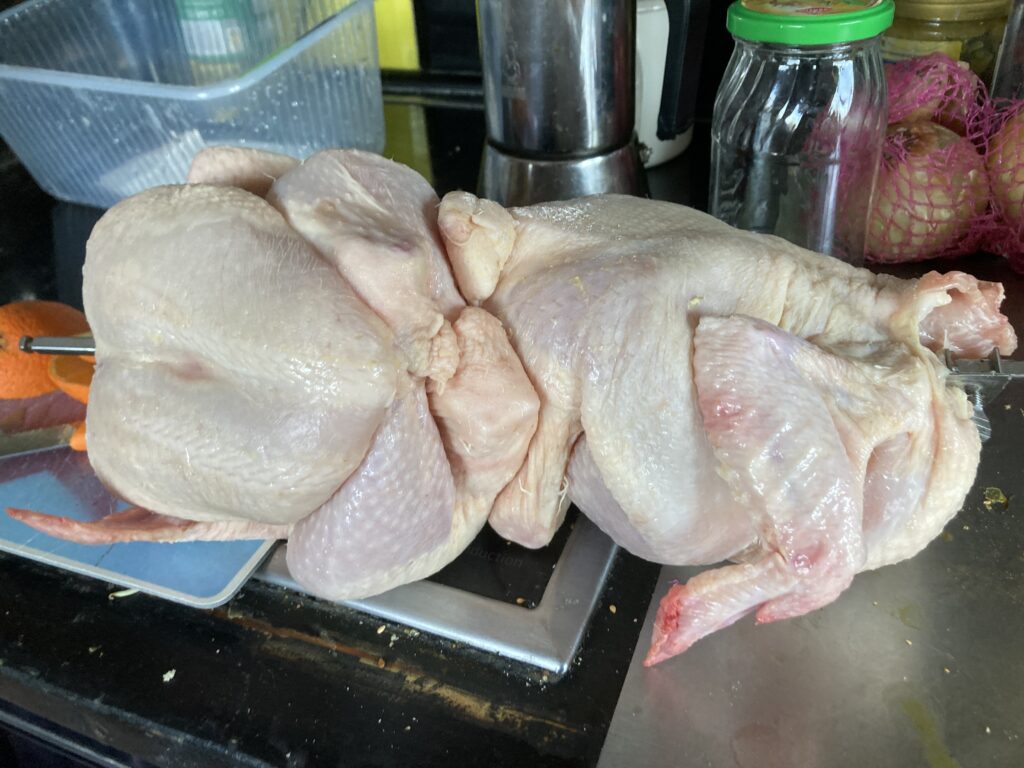 Beim Handelshof hatten sie im MHD Verkauf zwei Hähnchen mit jeweils 1,25 Kilo Gewicht und das Kilo kostete nur noch drei Euro. Dafür musste ich das mitnehmen und ich hatte spontan Lust auf Grillhähnchen, so wie früher vom Imbiss, aber ohne Mononatriumglutamat. Ich habe einen Elektrogrill mit Drehspieß im Keller stehen, den ich mir auf den Rest noch in Berlin kaufen musste, weil der Gasherd kurz vor dem Auszug im Ofenbereich den Geist aufgegeben hatte und die Schnekerliese noch Jugendweihe hatte und ich Kuchen backen musste und es damals ebenfalls Huhn gab. Da ich die Hühner aber immer beim Afghanen in handlichen drei Kilo Brummern gekauft habe, passte das Huhn nicht so richtig in den Grill ohne zu schrammen und aufzuschlagen. Diese beiden kleineren Hähnchen aus dem Handelshof passten gerade noch so richtig gut auf den Spieß, drehten mühelos und alles was abstehen könnte, habe ich mit Spießen und Steckern gesichert.