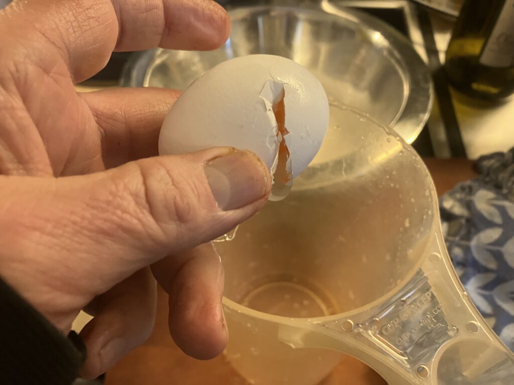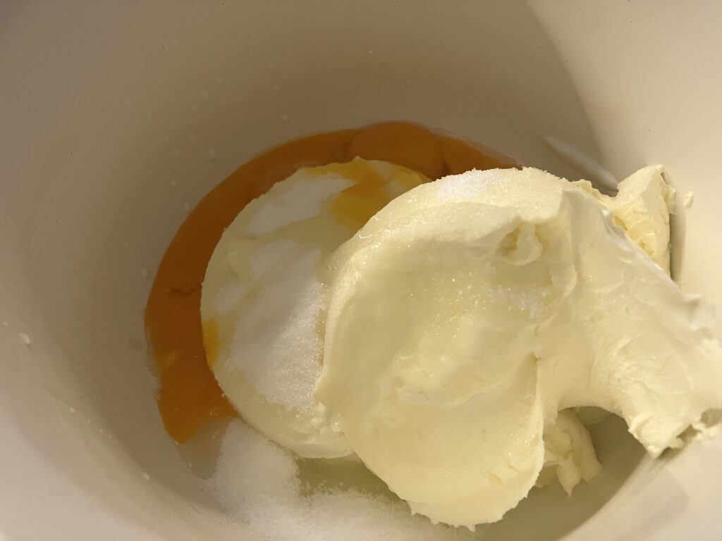 Das Eigelb kommt in die Schüssel in der Mehl und Zucker sind