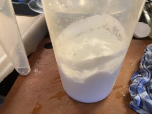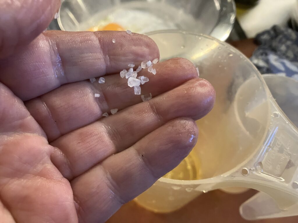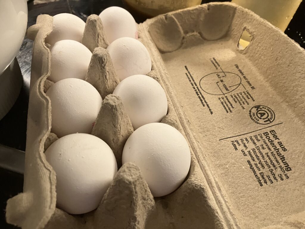 Um das Eiweiß zu Eischnee zu schlagen nehme ich ein bisschen Wasser als Notreserve. Manchmal braucht man das auch gar nicht dafür. Kommt immer auf die Eier an.