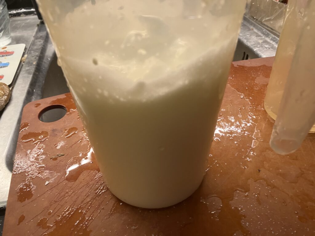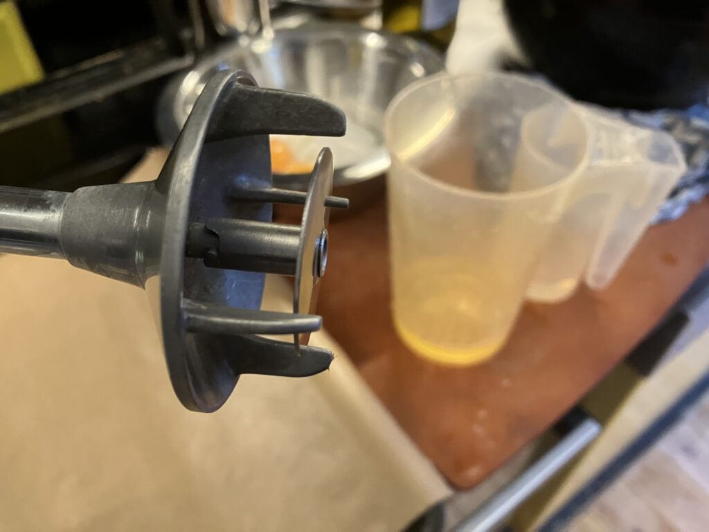 Zauberstab auf den Boden des Mixbechers stellen, der übrigens möglichst hoch und schmal sein soll, damit das Eiweiß schaumig wird.