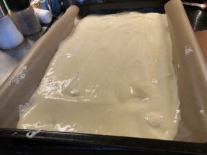 Der Teig wird auf dem mit Backpapier ausgelegtem Backblech verstrichen