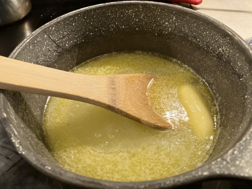 Butter und Zucker bei Vollgas auflösen und Wasser dazugießen, das verdunstet wieder, aber hilft mir beim Zucker einschmelzen