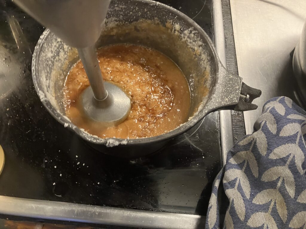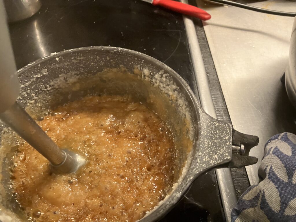 Ich habe die Temperatur wieder höher gedreht, damit es schmilzt und mit dem Zauberstab mit dem Knathaken, oder einem Pürierstab gerührt, damit der Zucker sich wieder mit der Flüssigkeit vermischt. Das klappt sehr gut.