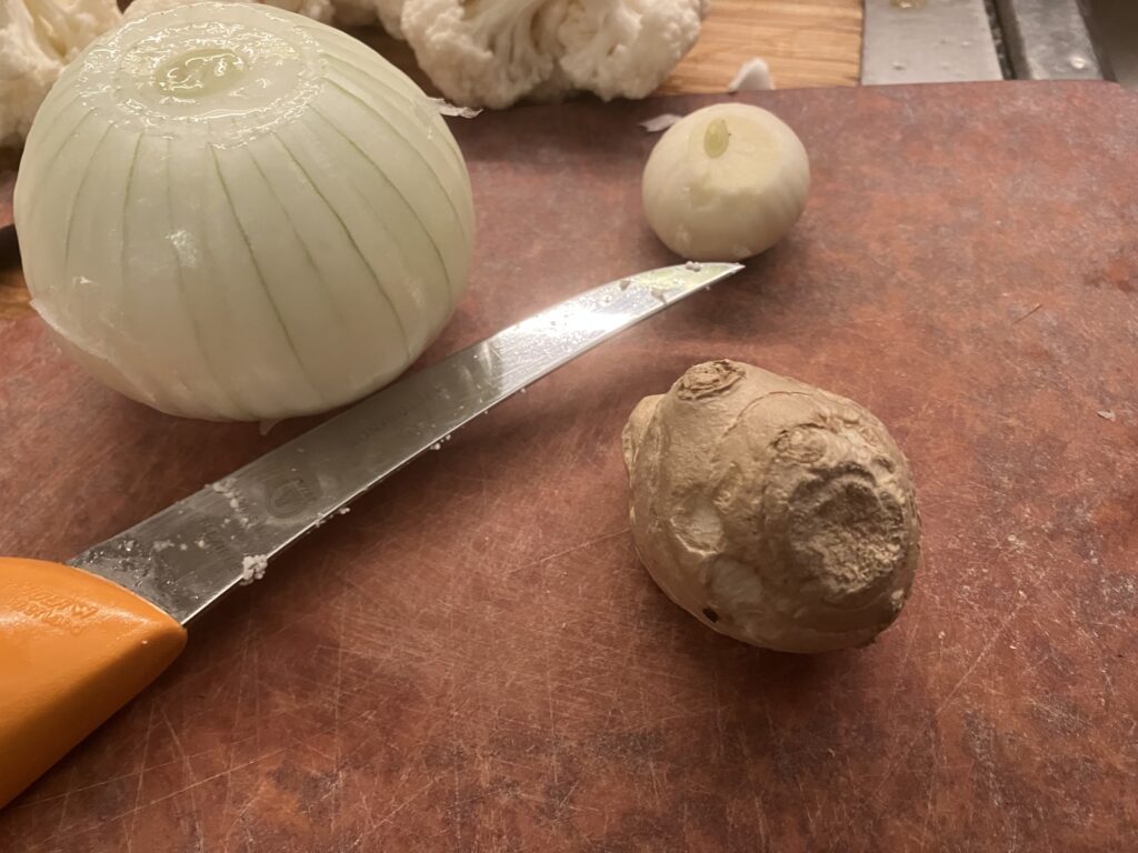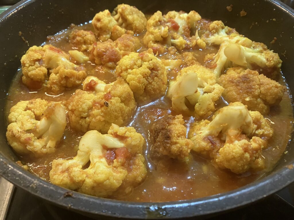 Blumenkohlcurry mit Reis. Das ist schlicht und ergreifend und selbst ich kann mich dem Reiz des Gerichts nicht entziehen, auch wenn ich diese Geschmackskombination noch nie mochte. Das schmeckt sehr frisch und hat trotzdem mehr Wärme als Chinesisch, oder Japanisch. Viele Menschen mögen das ja. Ich wäre immer noch eher bei den anderen beiden Küchen, aber trotzdem ist das wirklich sehr lecker und zufriedenheitsstiftend. Meiner Frau hat das so gut gefallen, dass sie dafür gleich bei Ihrer Onlinedamenrunde Reklame gemacht hat, aber hat denen erzählt das wäre wie Butterchicken, ohne Huhn. Dabei ist es einfach nur ein Curry. In dem Moment hatte ich dann aber schon die Aufgabe gewonnen, ein Butter Blumenkohlchicken, ohneChicken zu machen. Das wartet hier auch schon auf Veröffentlichung,