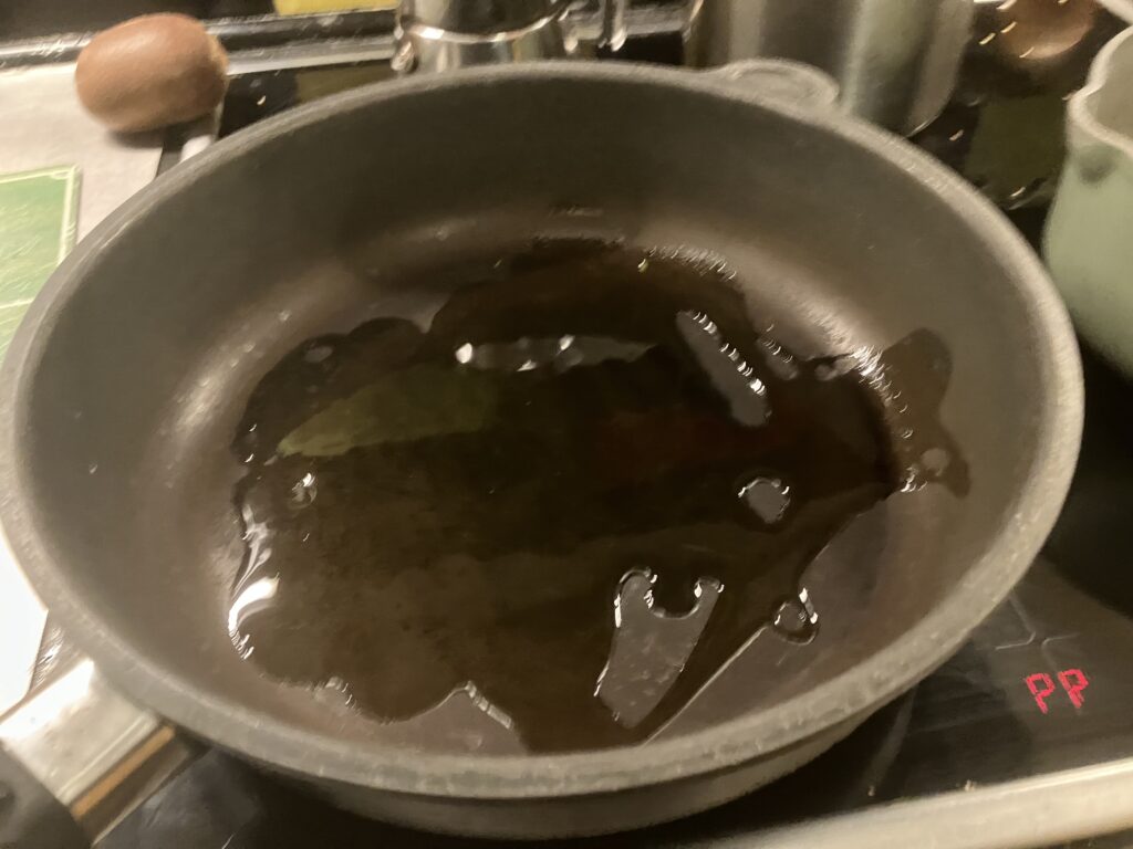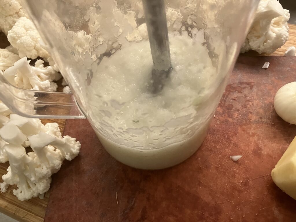 Olivenöl in der Pfanne erhitzen, also zwei Handlungsstränge. Hier auch Vollgas geben und den Blumenkohl in die Pfanne legen