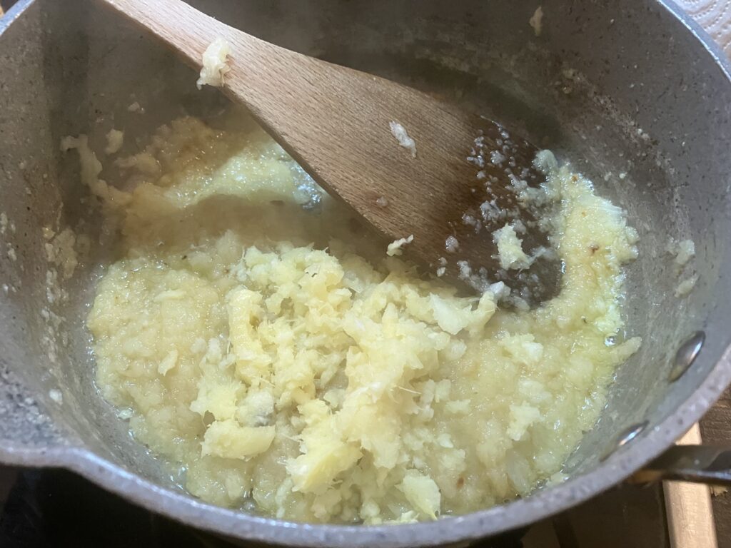 Wenn die Zwiebel glasig ist und braun wird, kommt der geschredderte Ingwer-Knoblauchmix in den Topf zur Zwiebel