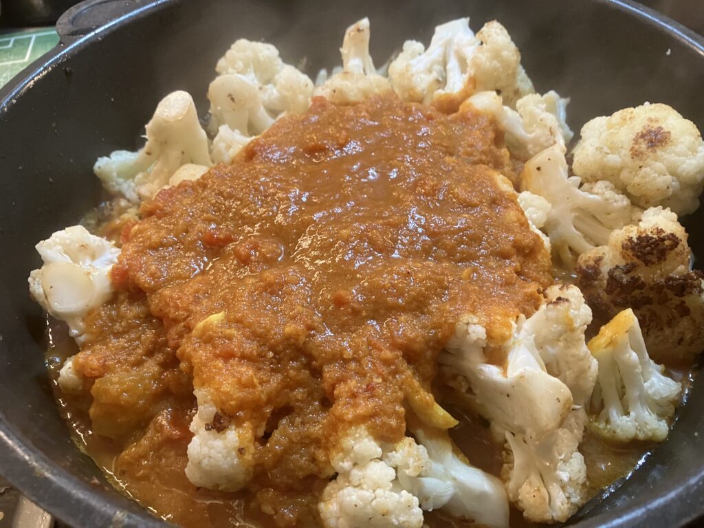 Wenn sich das Öl auf der Soße absetzt ist sie fertig, der Blumenkohl ist jetzt 12 Minuten in der Pfanne und immer noch mit Biss.